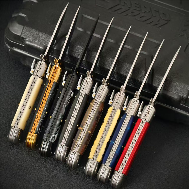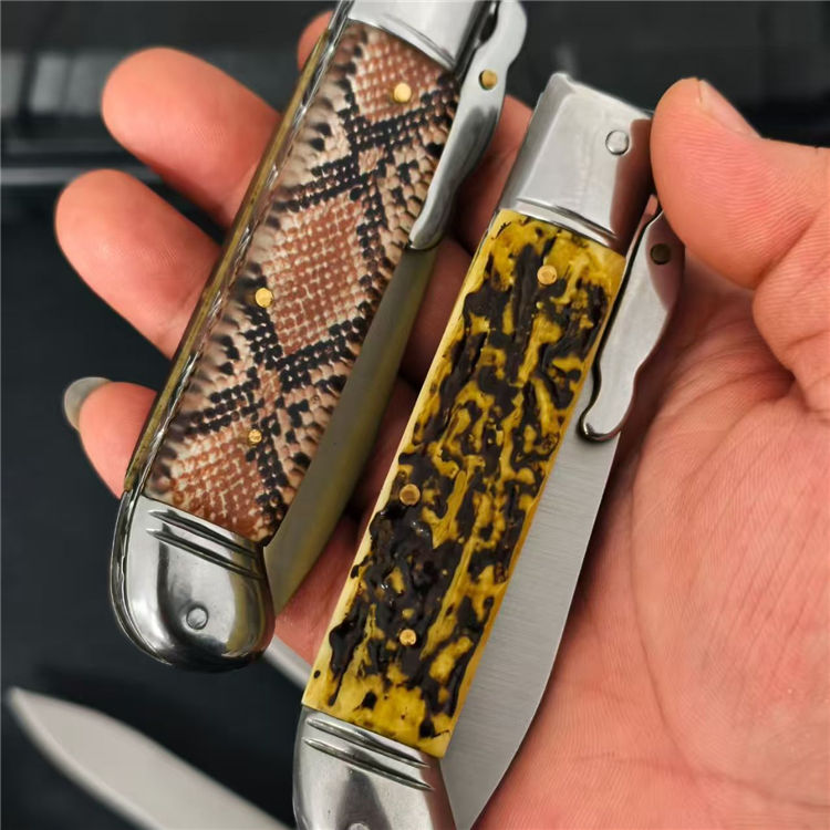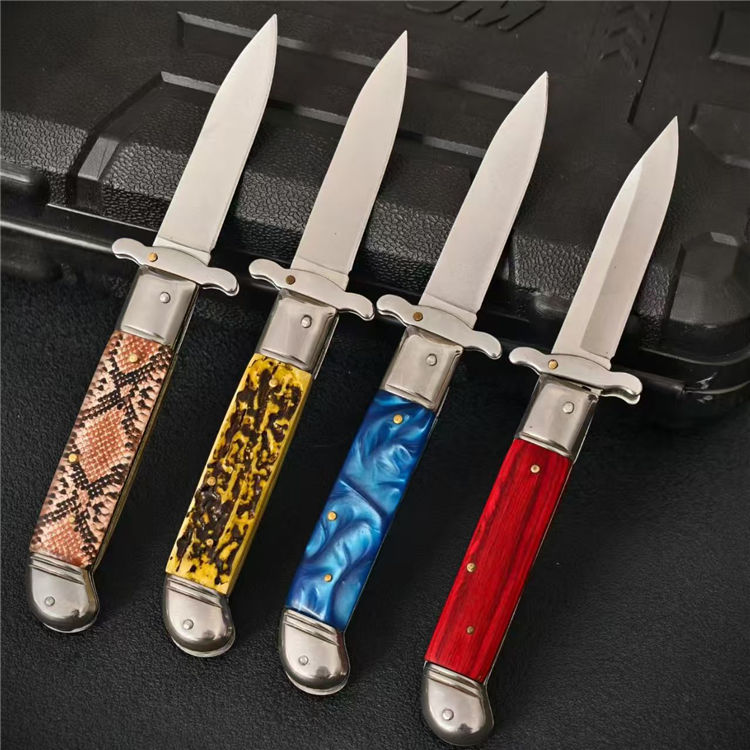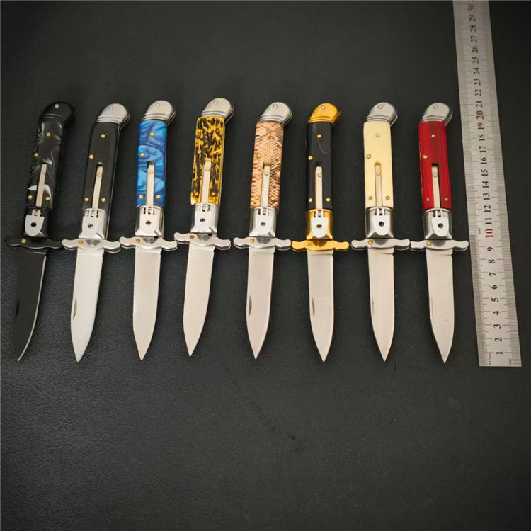 意大利黑手党F3侧开跳刀 全长:20.7cm 柄长:11.3cm 刃长:8cm 柄材:树脂/彩木 材质:7CR 厚度:3mm 刃宽:1.9cm 重量:135g