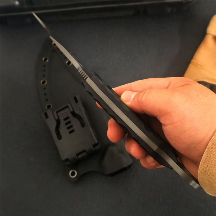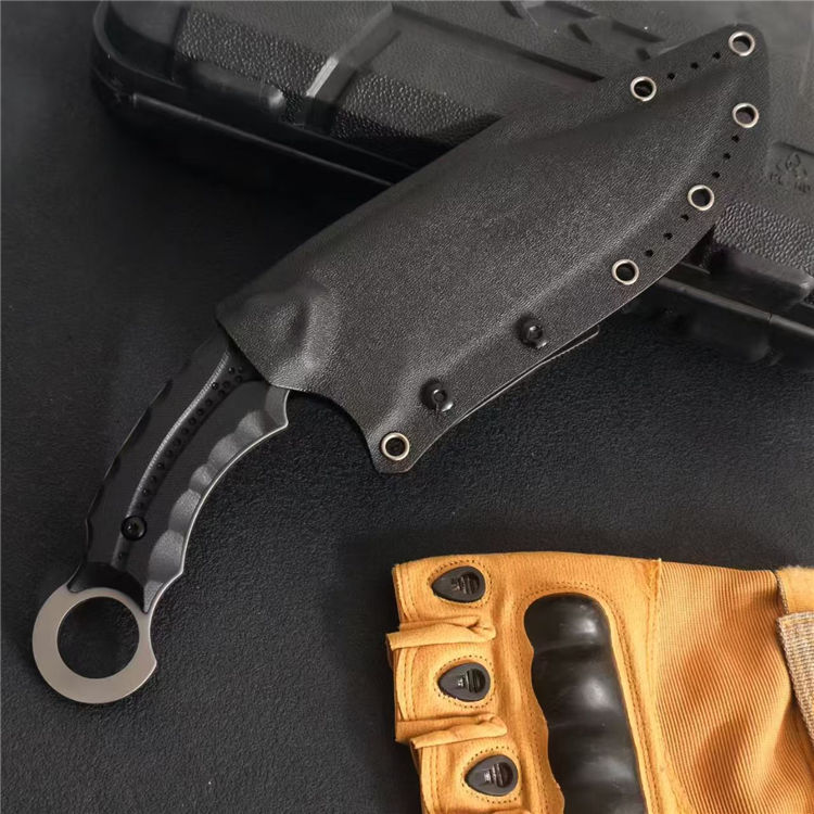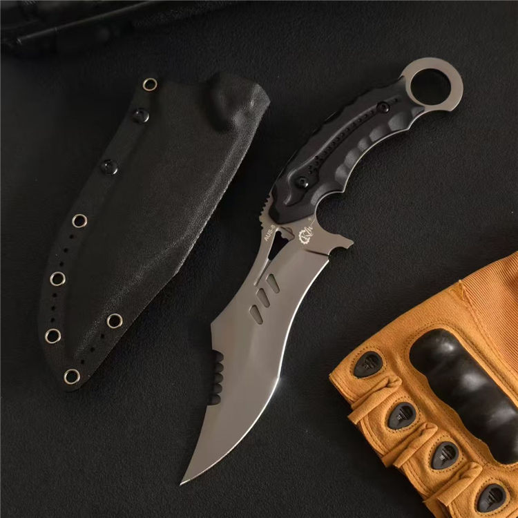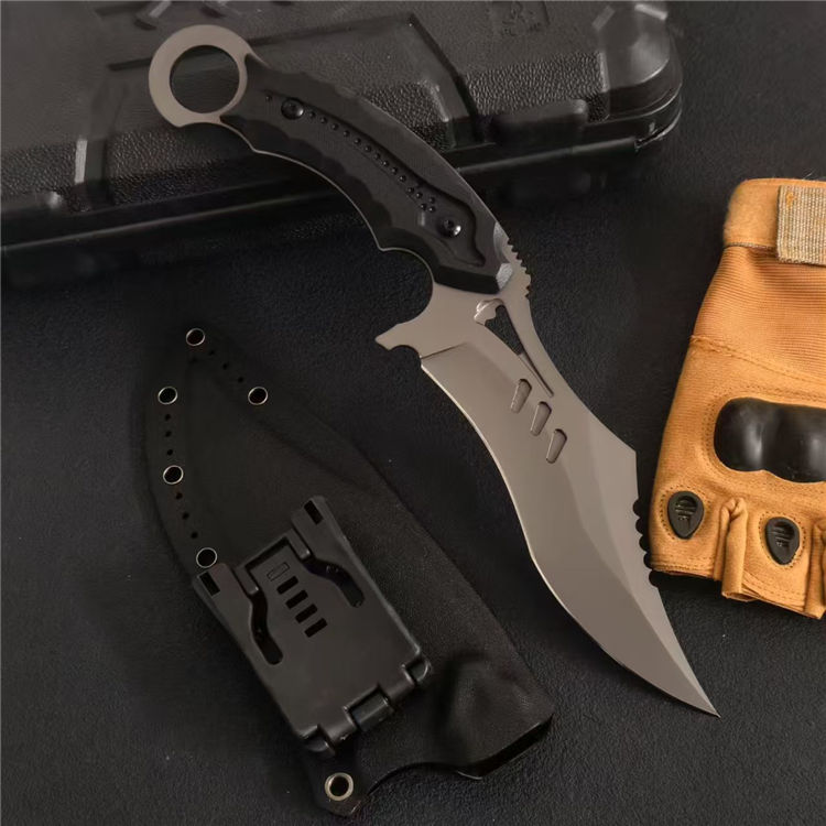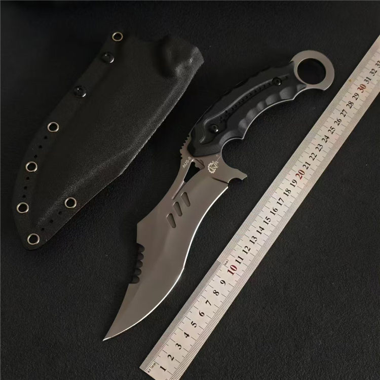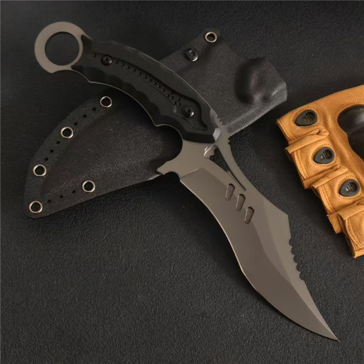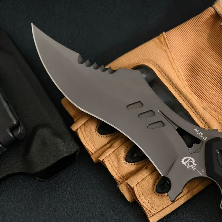 鳄龙爪刀 总长:30.3cm 刃长:15.5cm 刃宽:4.6cm 刃厚:5mm 重量:352G(含鞘462g) 钢材:AUS-8 硬度:60HRC 热处理:真空热处理 柄材:黑色G10复合材质电脑CNC加工 包装:黑色手工盒子包装