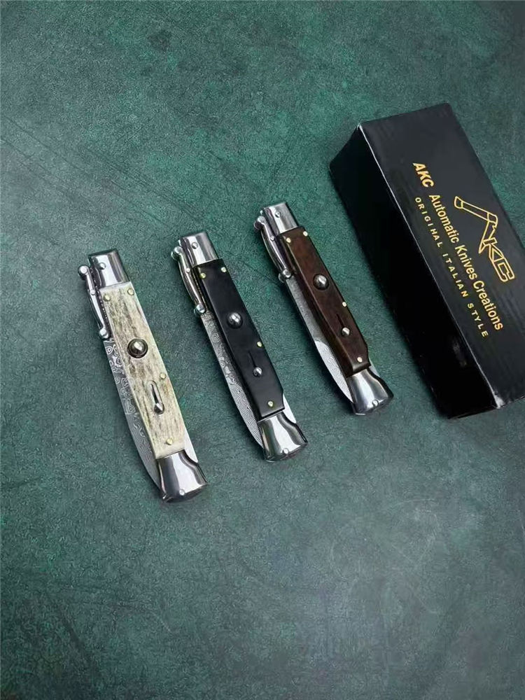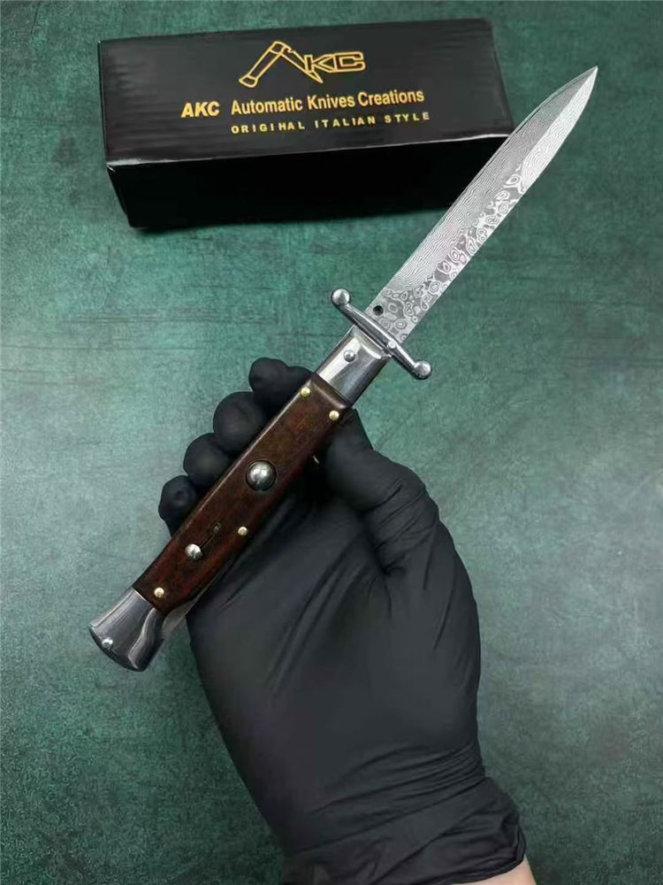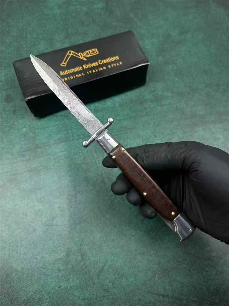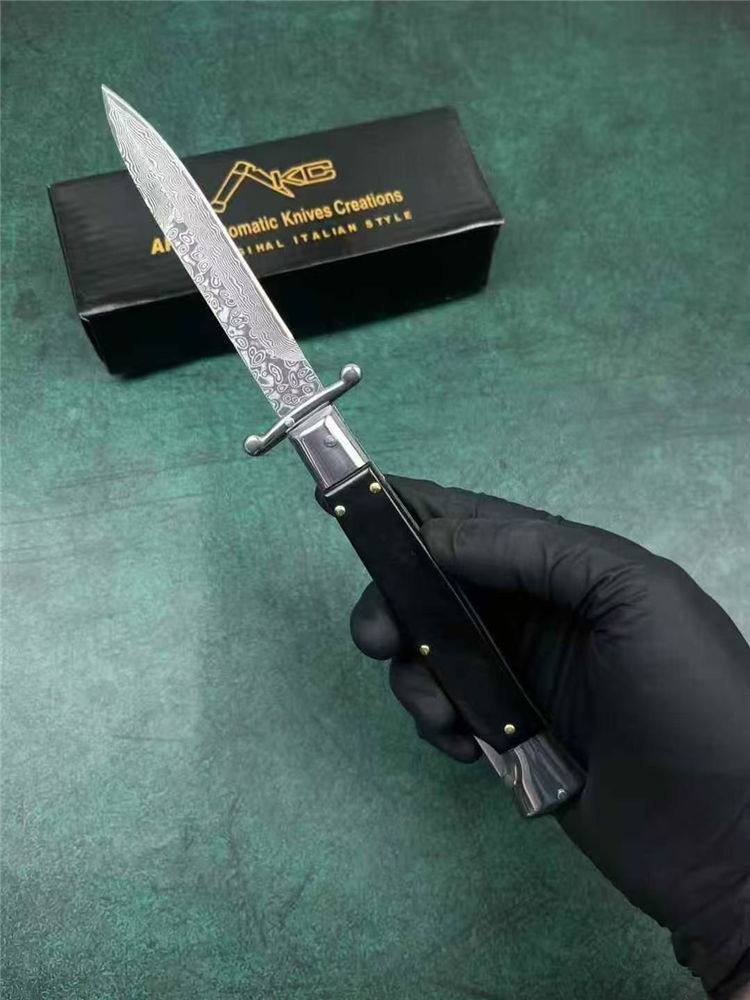 大马士革黑手党守护神侧开跳刀 全长:23cm 刃长:10cm 刃厚:3mm 刃材:大马士革钢 硬度:60 柄材:钢+牛角 重量:30克 包装:礼盒