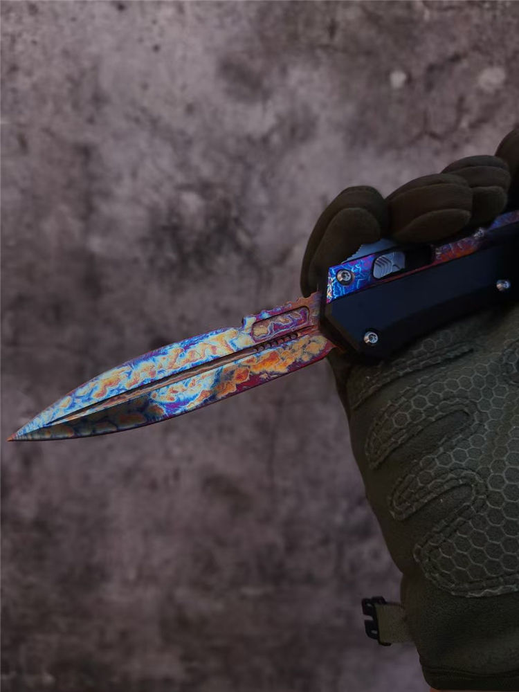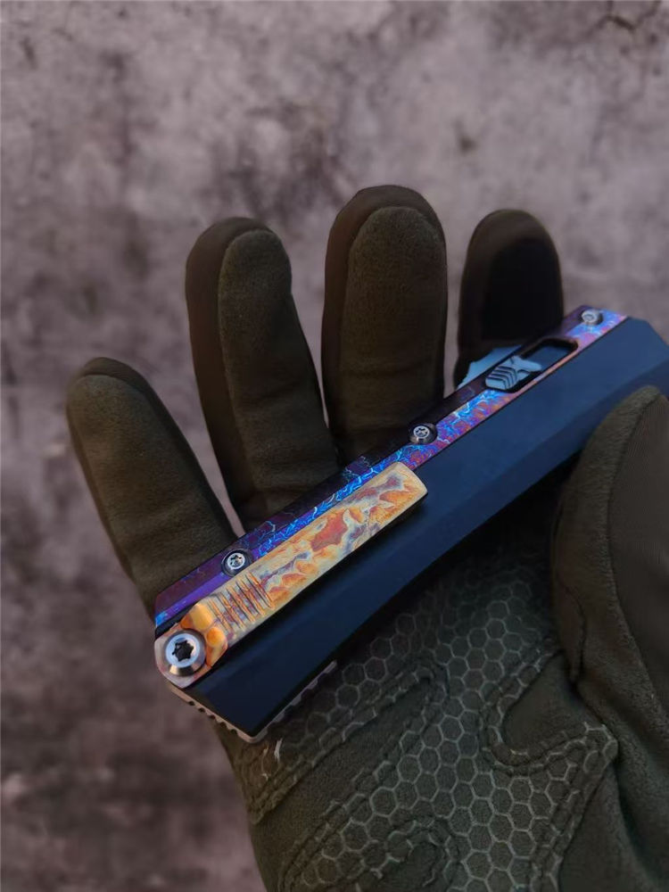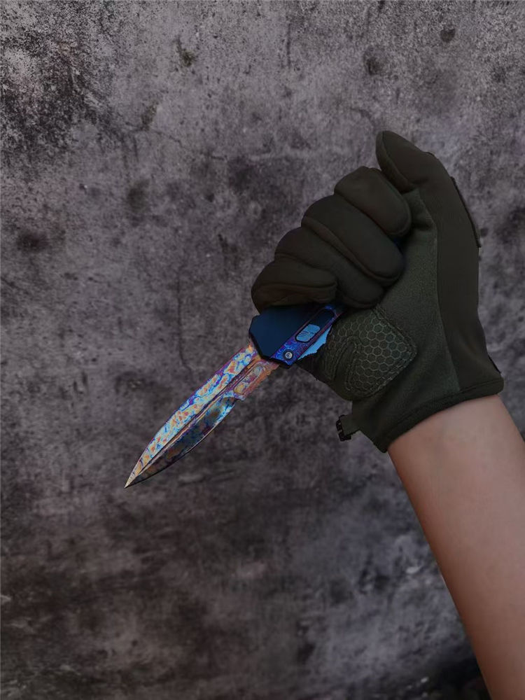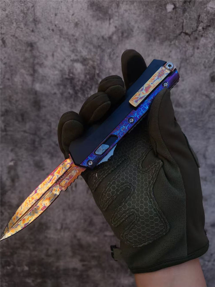 微技术蛇神风暴闪电纹版直出跳刀 全长:22cm 刃长:9.5cm 刃厚:2.95mm 刃宽:20.3mm 柄厚:13.7mm 柄宽:28mm 刃材:m390 柄材:7075铝合金,tc4钛合金贴片 硬度:60HRC 重量:143g
