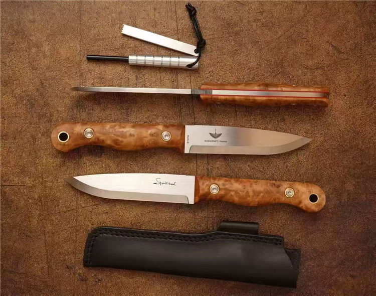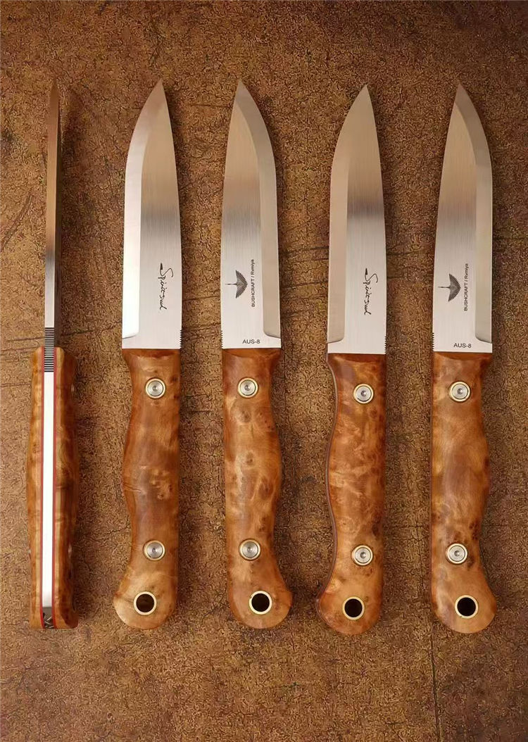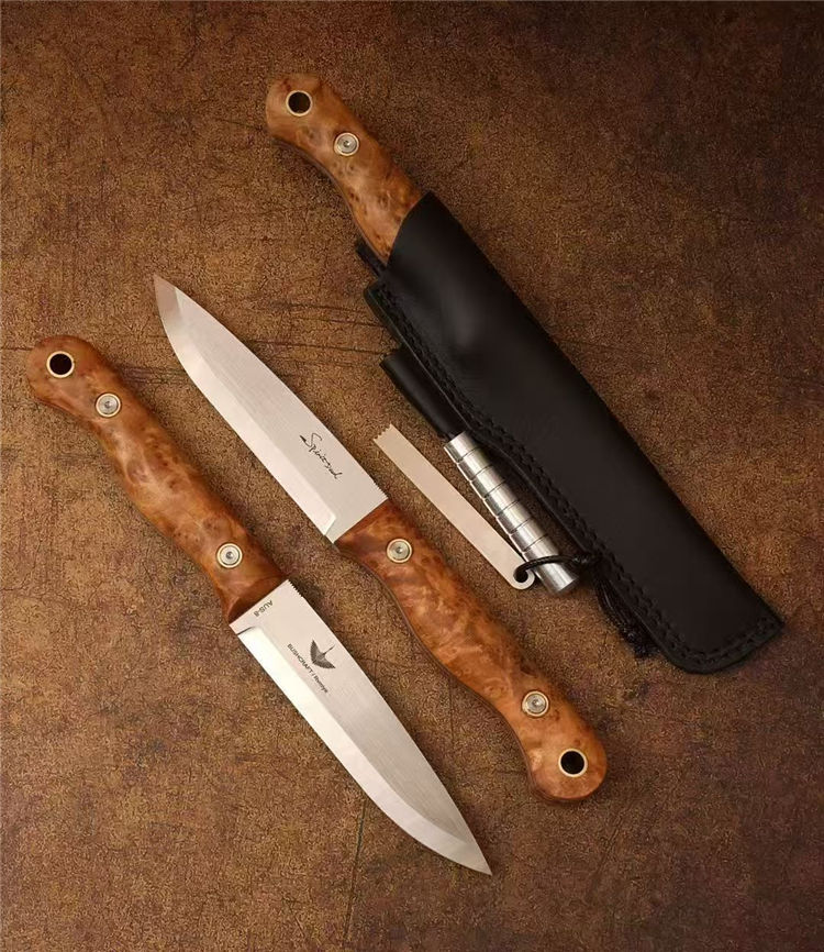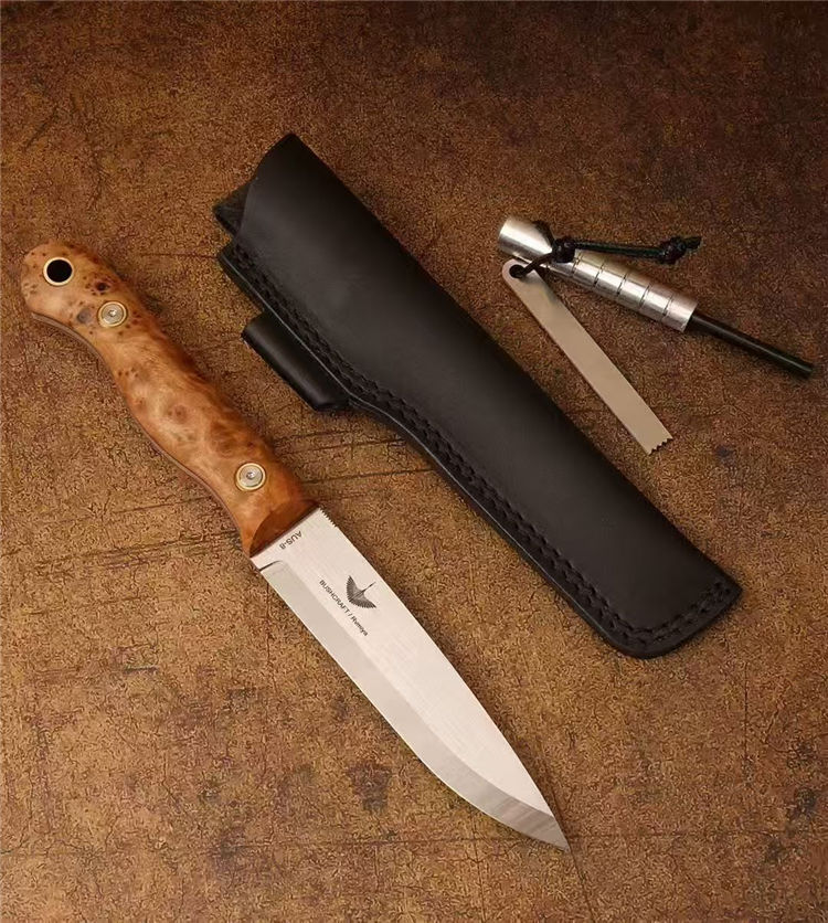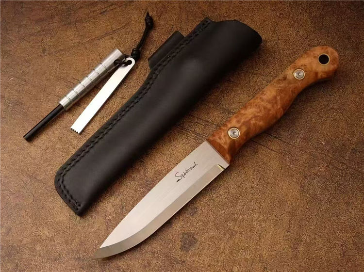 北欧芬兰雷胖子直刀 全长:25cm 刃长:12cm 刃材:进口AUS-8钢 硬度:58-60HRC 表面:手工抛光拉丝 热处理:真空深冷热处理,低温二次回火 柄厚:2.3cm 柄材:稳定雀眼枫木树瘤,内藏红G10复合材质(天然木花纹有深浅与大小) 刃厚:4mm 刃宽:2.8cm 重量:199克 设计者:FANG XIN 类型:北欧芬兰生存刀,佩戴皮质刀鞘+打火石镁棒 包装:手工黑色盒子包装附送皮绳装饰