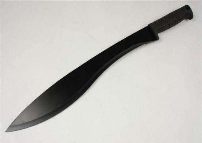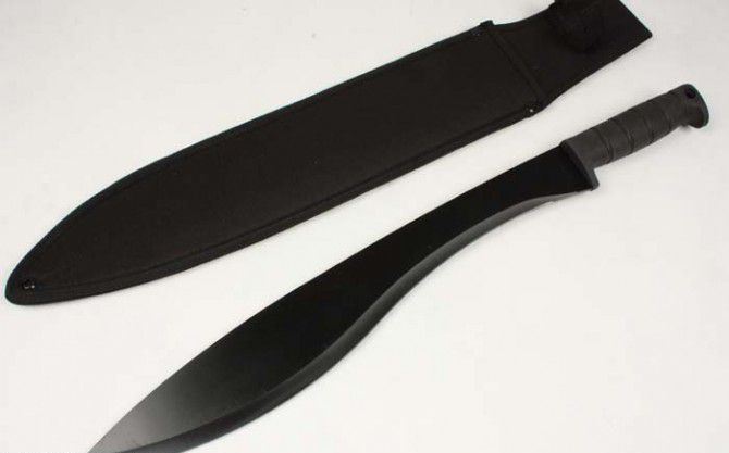 全长: 55CM 刃长: 41.5CM 刃宽: 6CM (最宽处) 刃厚: 0.3MM 硬度: 56HRC 重量: 790克(含套) 材质: 420不锈钢 涂层: 氧化黑 柄材: 塑胶,刀身贯穿至刀柄底部圆孔处 刀鞘: 尼龙套 产地: 国内代工