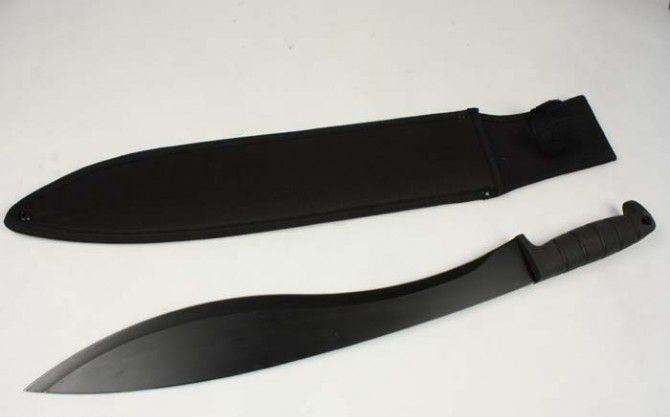 卡巴大狗腿 I(081-1) 全长: 55CM 刃长: 41.5CM 刃宽: 6CM (最宽处) 刃厚: 0.3MM 硬度: 56HRC 重量: 790克(含套) 材质: 420不锈钢 涂层: 氧化黑 柄材: 塑胶,刀身贯穿至刀柄底部圆孔处 刀鞘: 尼龙套 产地: 国内代工