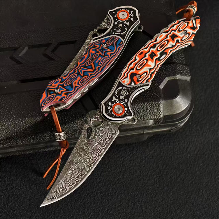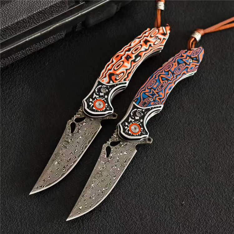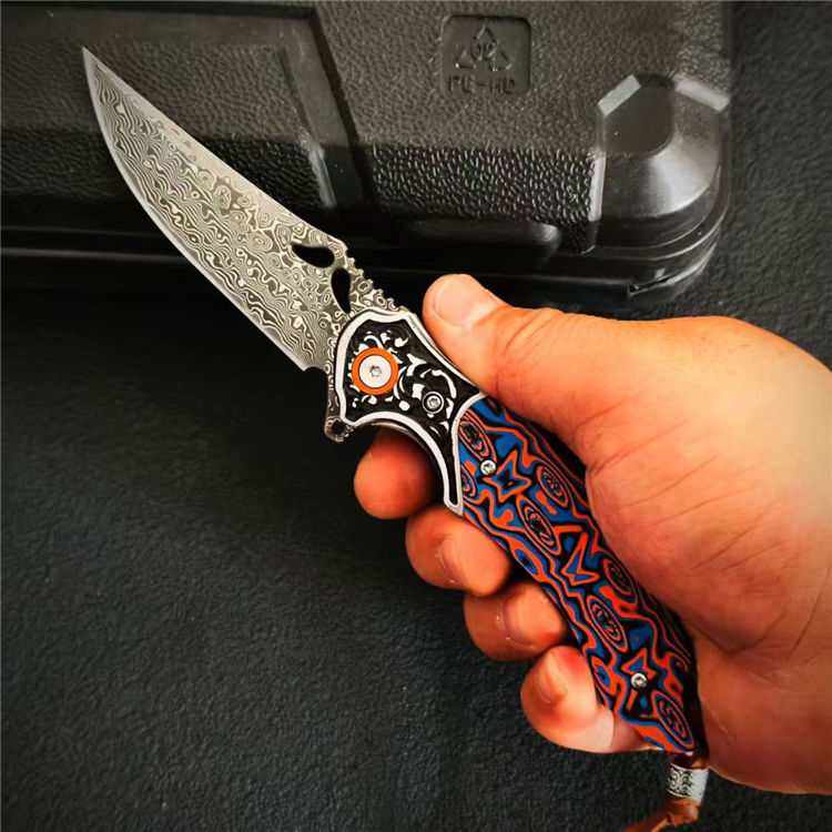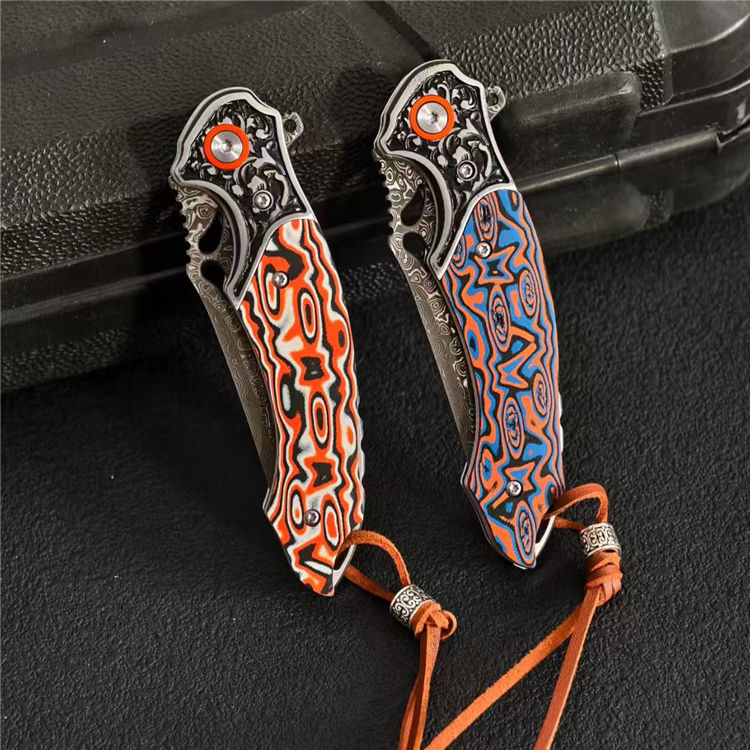 大马士革麒麟折刀 总长:19.8cm 刃长:8.3cm 柄厚:1.5cm 刃厚:0.3cm 柄宽:2.6cm 柄度:11.5cm 刃材:大马士革 颜色:橙白、橙蓝 硬度:59HRC 刃宽:2.4cm 柄材:G10+不锈钢 表面:酸洗工艺 重量:132g