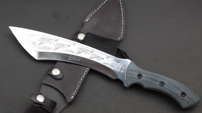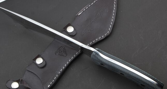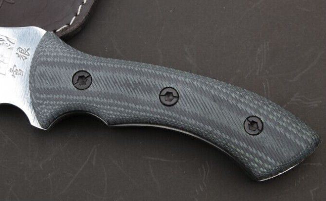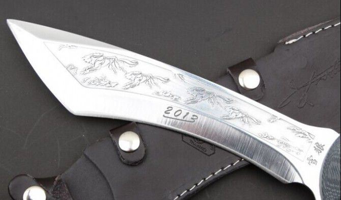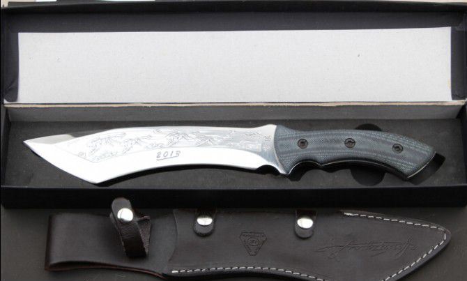 雪狼( 米卡塔柄) 全 长:385mm 刃 长:235mm 柄 长:150mm 刃 宽:54mm 刃 厚:6.1mm 刃 材:5Cr13Mov 重 量:580g(含包装) 硬 度:57HRC 表 面:砂光 柄 材:米卡塔柄 锁 型:定锁 其 他:配牛皮套木盒