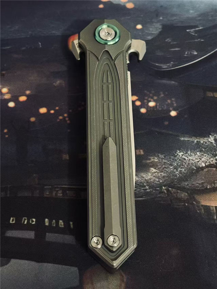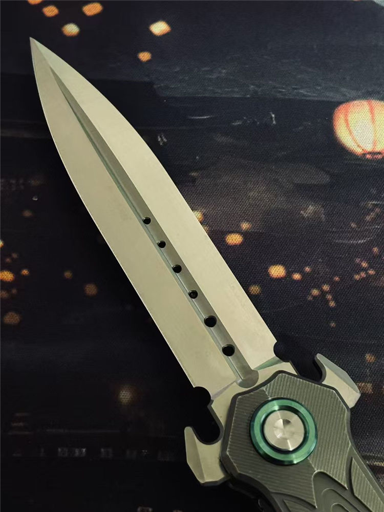 核心撕裂者折刀 全长:22.5cm 刃长:9.5cm 刃宽:2cm 刃厚:4mm 柄长:12.5cm 刃材:美国进口D2钢(真空深冷热处理) 刃面:缎面 硬度:60—61HRC 柄材:TC4钛合金(精密CNC加工) 背夹:TC4钛合金 系统:陶瓷滚珠轴承,主轴螺丝圈钛合金 重量:118g+−