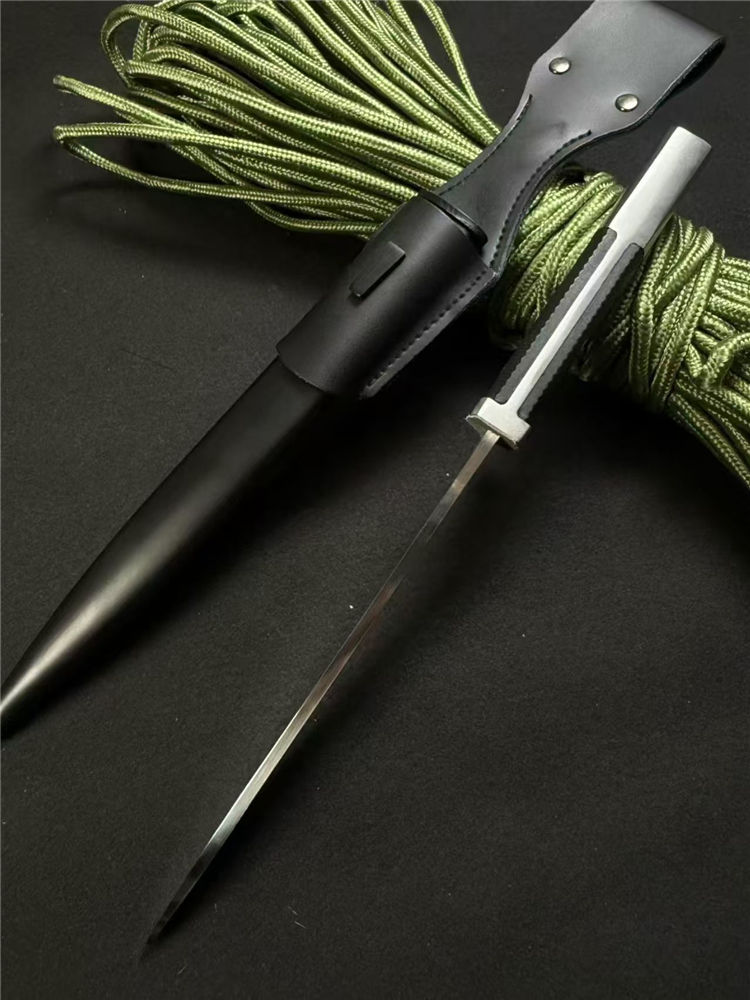 短款德国二战青年团直刀 总长:31.5cm 刃长:18cm 柄长:12.5 刃厚:4mm 柄厚:2cm 刃宽:2.8 刃材:1095高碳钢 刀鞘:金属+皮挂 硬度:58± 总重:480g 鞘重:160g 刀重:320克