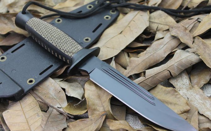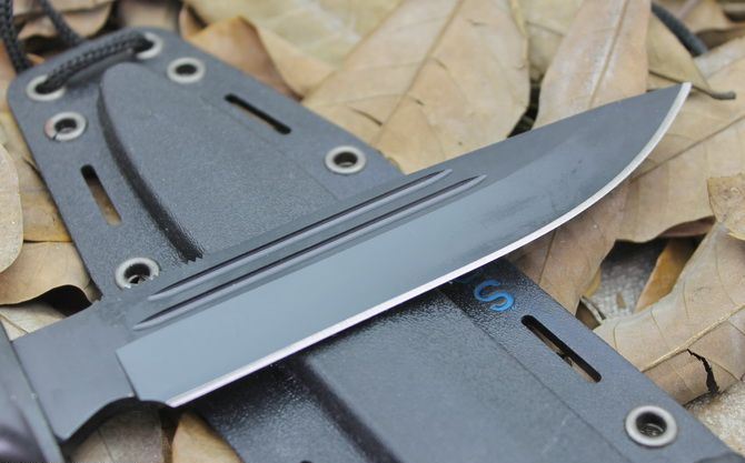 SOG.S21T双槽格斗刀 全 长: 26.6cm 刃 长: 14cm 刃 宽: 3cm(最宽处) 柄 长: 11.5cm 刃 厚: 0.45cm 刃 材: 440 硬 度: 56RHC 表 面: 发黑 柄 材: 实木,经电脑锣精加工防滑格纹 重 量: 260克(含套) 其 他: 护手和柄尾采用精铸铝;工程塑料战术鞘,带扎腿绳;雙側各兩條血槽