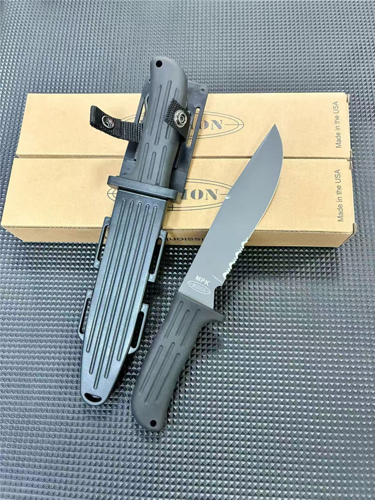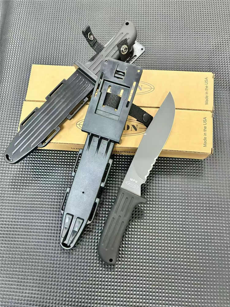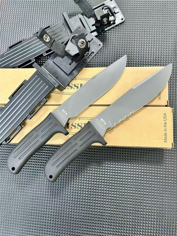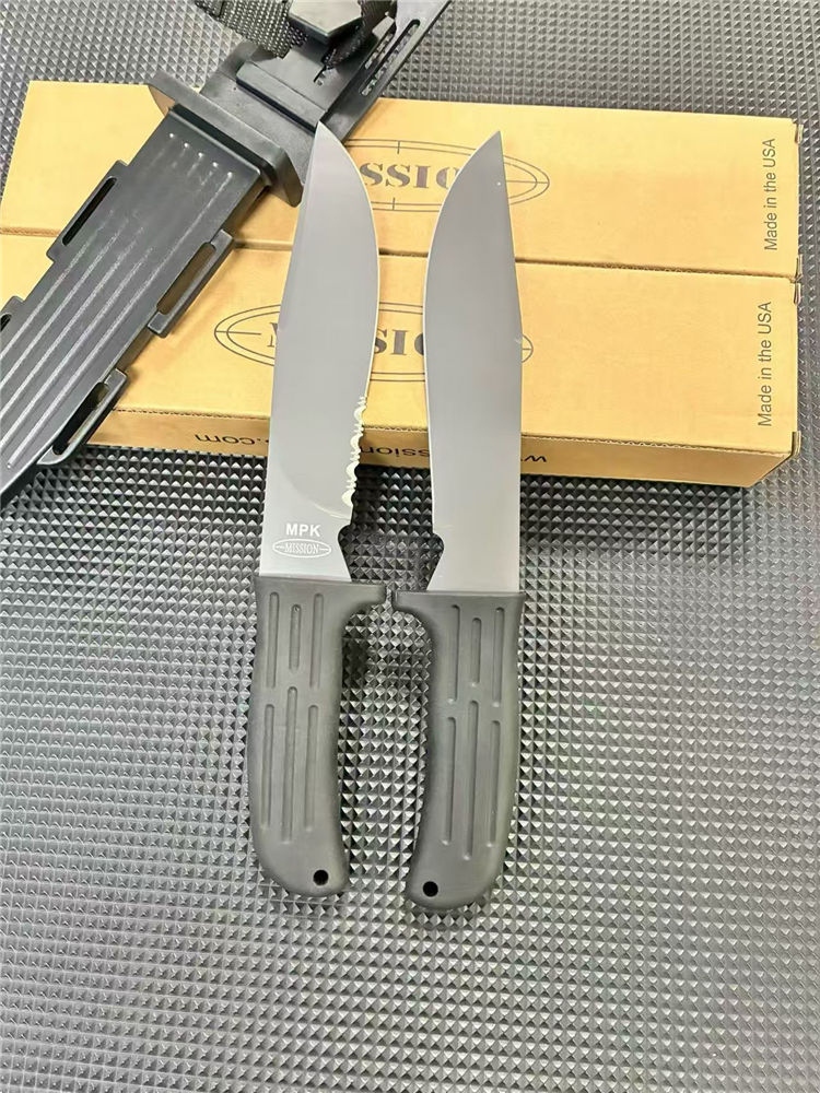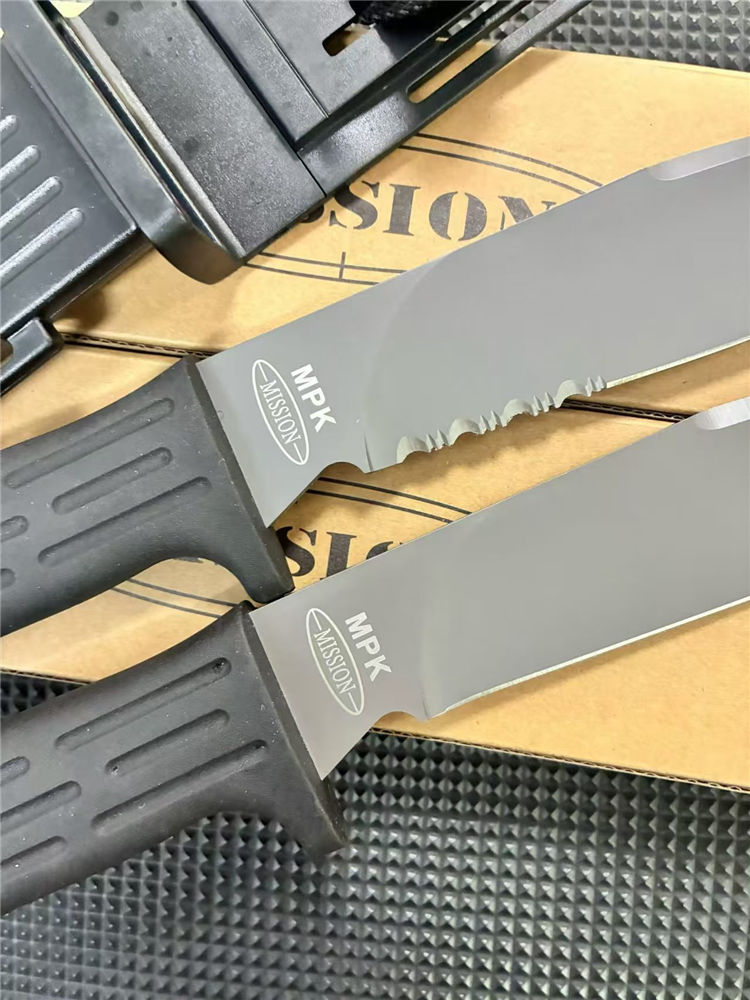 美国使命MPK-A2直刀 全长:300mm 刃长:155mm 柄长:120mm 刃材:A2 硬度:60HRC 刃厚:6.3mm 柄材:kevlar / hytrel混合物 (抗热,不导电) 刃鞘:订制鞘 单刀重量:330g