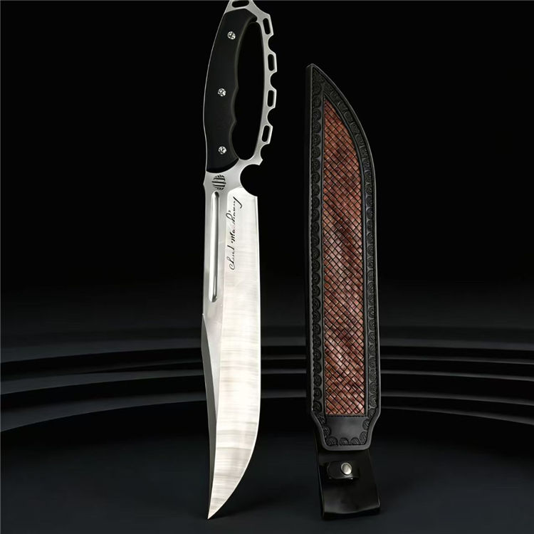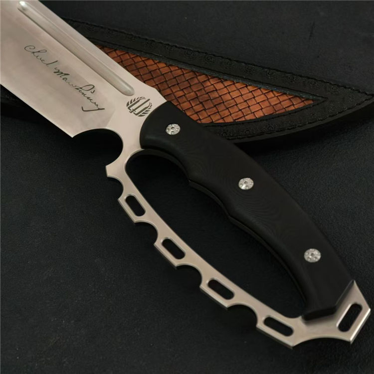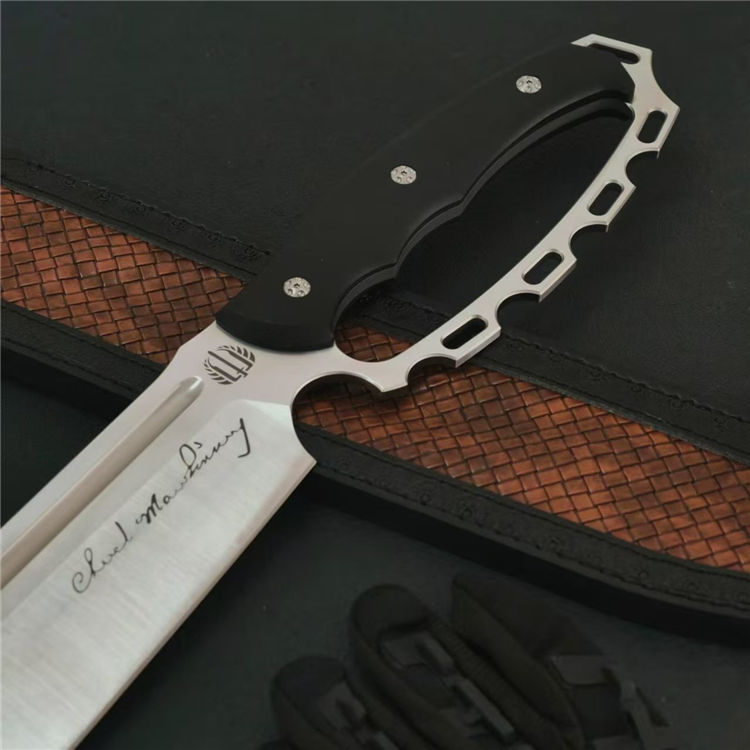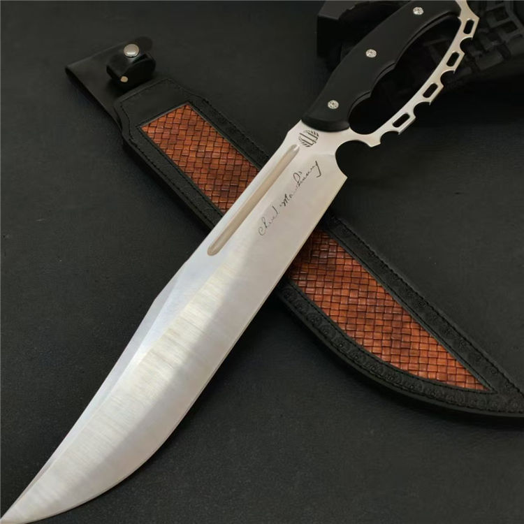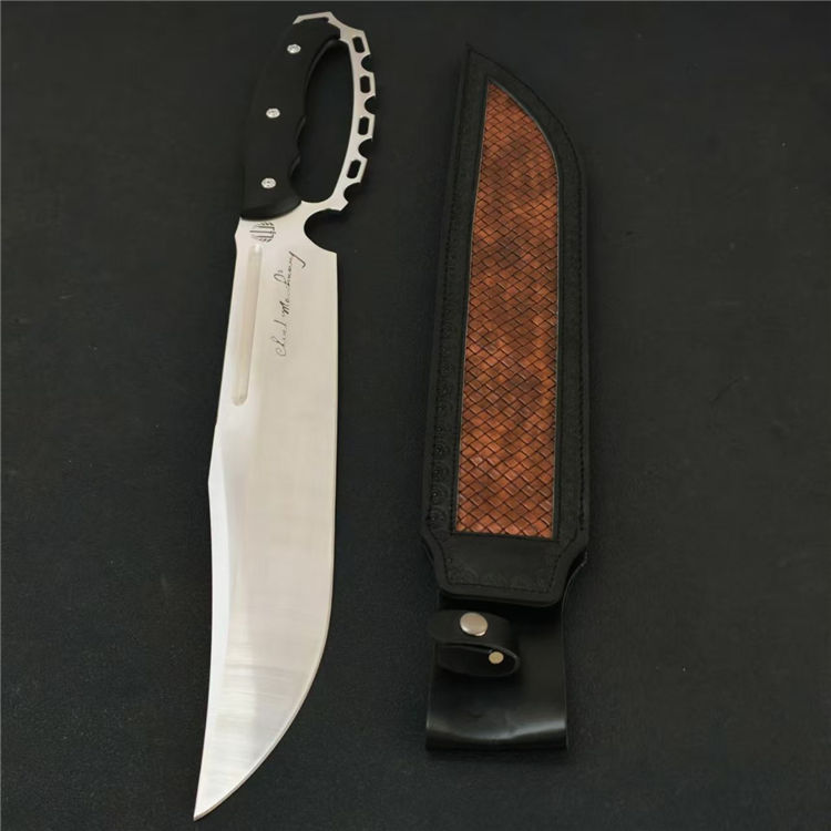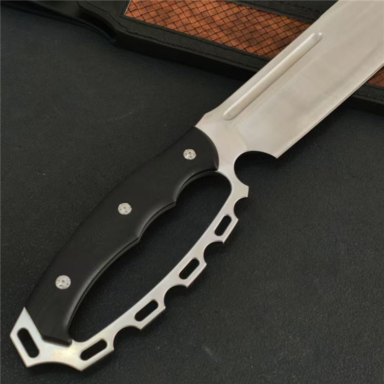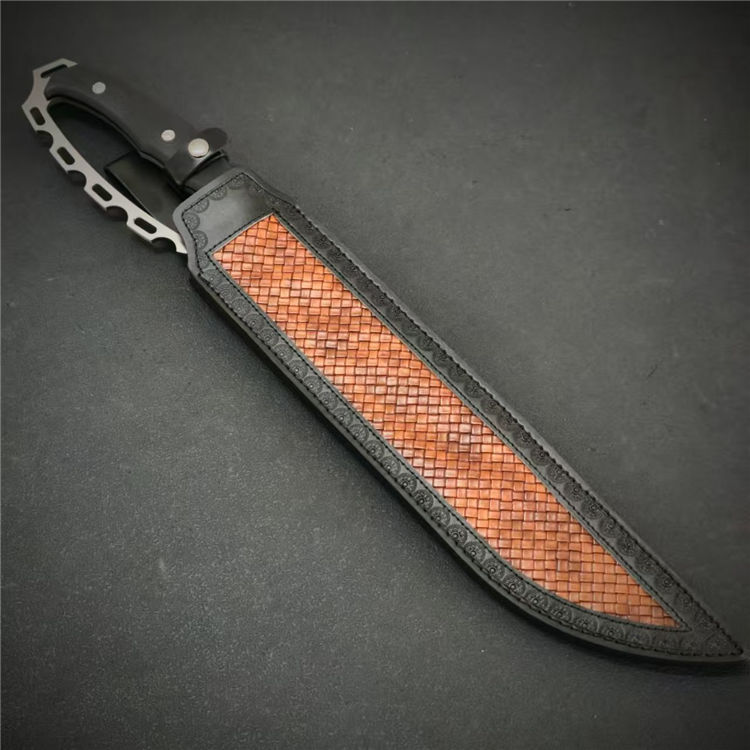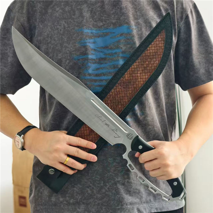 米克黑棘守夜手环直刀 全长:63cm 刃长:39cm 钢材:弹簧钢 柄材:G10 刃宽:7.2cm 刃厚:6mm 柄长:22cm 重量:1360g(皮套226g)