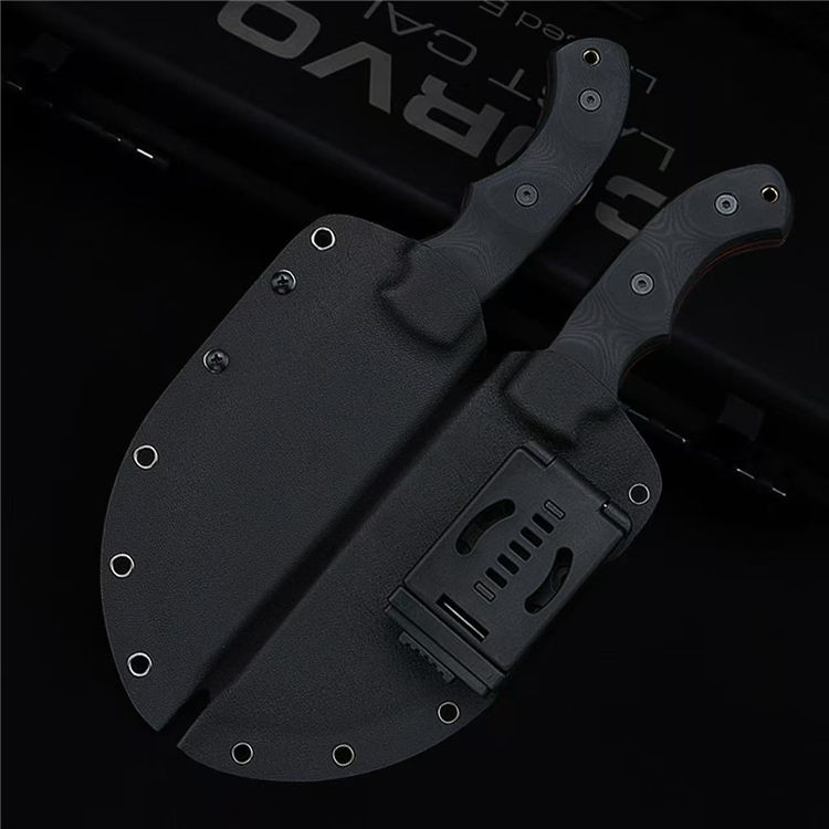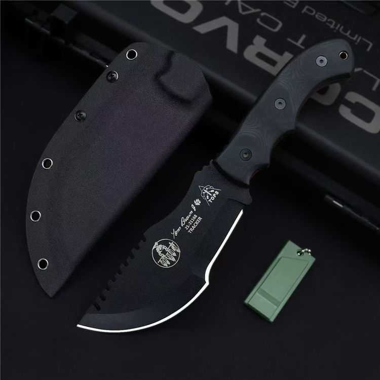 复刻美国尖端TOPS追踪者直刀 全长:30.5cm 刃长:16cm 刃厚:0.65cm 刃材:1095钢 硬度:56-58 柄材:黑色亚麻米卡塔 重量:裸刀642.3克含鞘重:793克 包装:黑色礼盒 附件:口哨