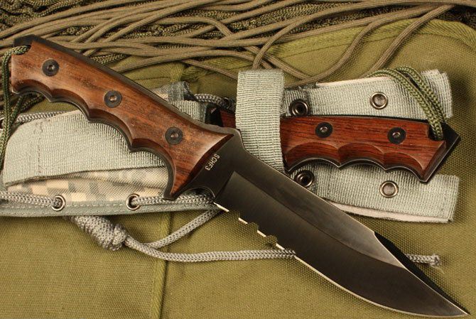 全 长: 30cm 刃 长: 15cm 柄 长: 14cm 刃 厚: 5.5mm 刃 材: 5CR13 硬 度: 57HRC 净 重: 410g 总 重: 700g(包括纸盒和刀鞘) 柄 材: 黑檀木 表 面: 钛离子 刀 鞘: CORDURA(科杜拉)