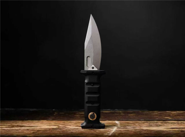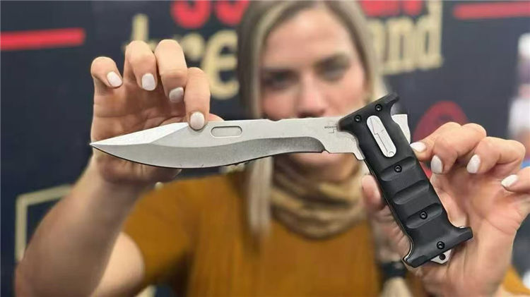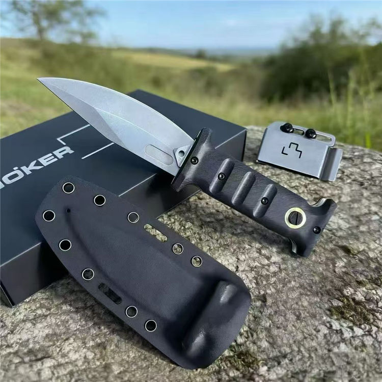 德国boker-Extension Knife,折叠时,刀柄恰好覆盖刀刃的一半,而另一半则伸出刀柄。D2 刀片通过一个大型十字螺栓在打开和关闭时固定,这个十字螺栓也可以在没有工具的情况下拧入手柄中,使刀在完全打开和缩短时都更加耐用,由两块厚钢板和铣削G10制成的手柄,为了多功能使用,刀柄末端有一个坚固的打击钉,这把刀配有一个定制的Kydex鞘