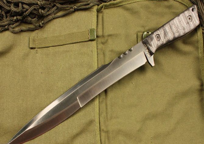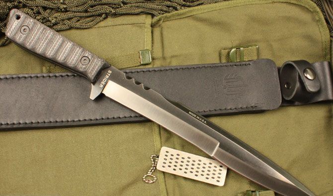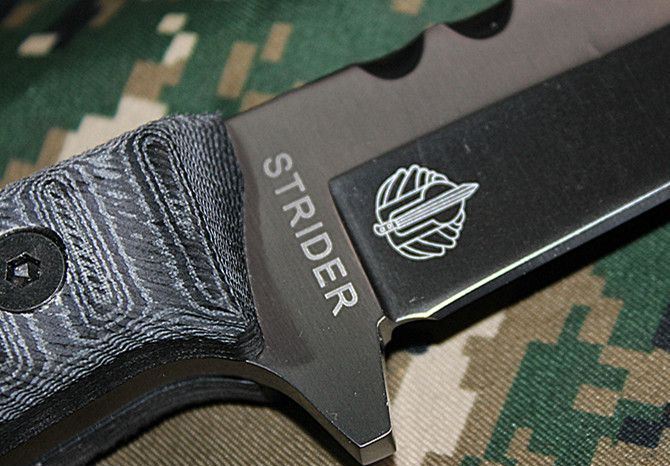 全长:39.5cm 刃长:26.8cm 刃宽:3.2cm 刃厚:0.62cm 刃材:440C高级不锈钢 硬度:57HRC 柄长:12cm 刀重:460克 总重:720克(含包装物) 柄材:玻纤亚麻高压复合材料 表面:钛金处理(防锈硬度高) 品质:高品质 其他: 刀身两处有Strider的草体签名。 附件:专用战术真皮刀套,STRIDER专用磨刀石,英文说明书