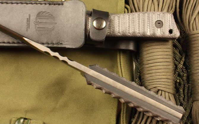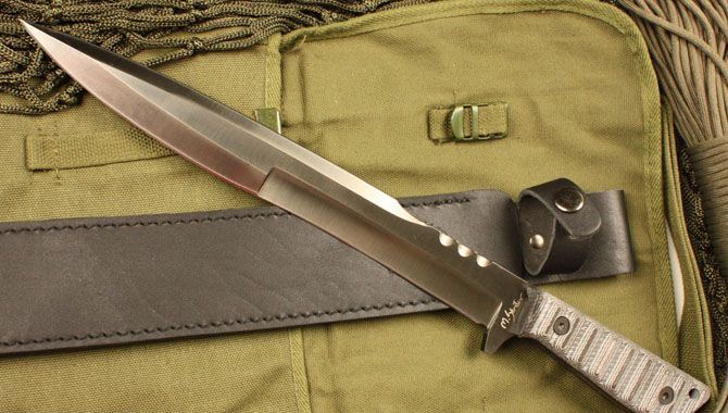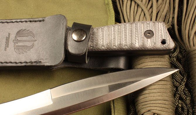 米克-终极武士长刀(钛金版) 全长:39.5cm 刃长:26.8cm 刃宽:3.2cm 刃厚:0.62cm 刃材:440C高级不锈钢 硬度:57HRC 柄长:12cm 刀重:460克 总重:720克(含包装物) 柄材:玻纤亚麻高压复合材料 表面:钛金处理(防锈硬度高) 品质:高品质 其他: 刀身两处有Strider的草体签名。 附件:专用战术真皮刀套,STRIDER专用磨刀石,英文说明书