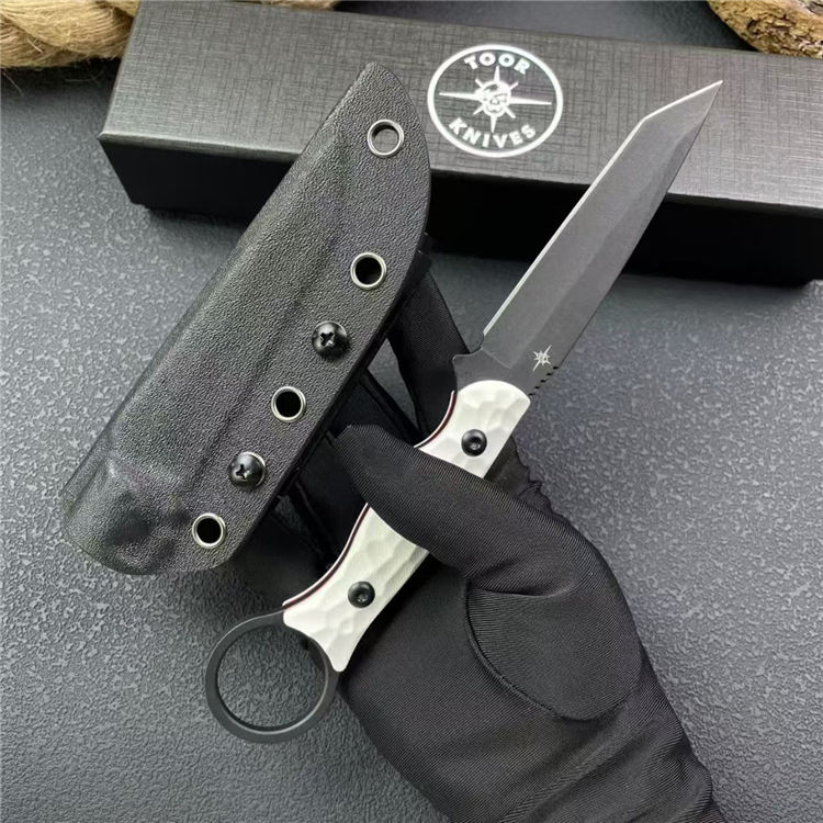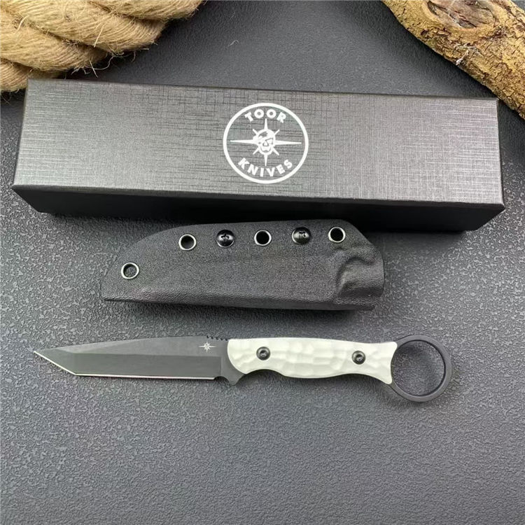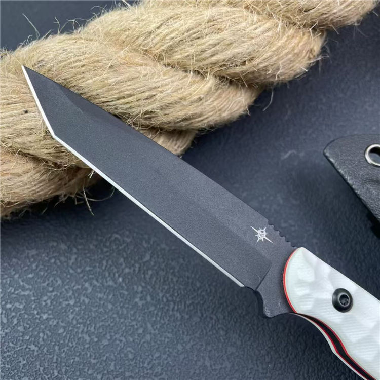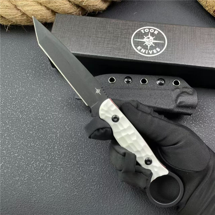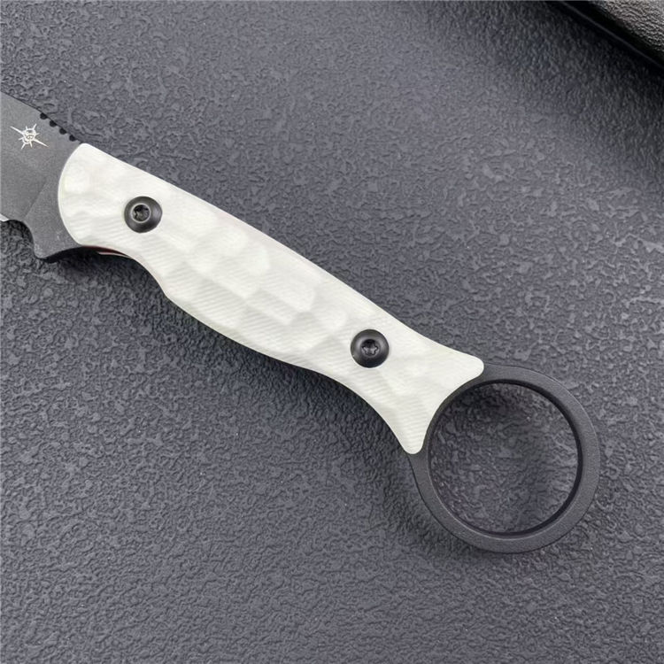 圣地亚哥白月指环直刀 全长:20.8cm 刃宽:2.2cm 刃长:9cm 柄长:11cm 刃厚:4mm 刃材:M390 柄材:钢片+G10 刀重:110G/168G 毛量:245G 硬度:58-60HRC