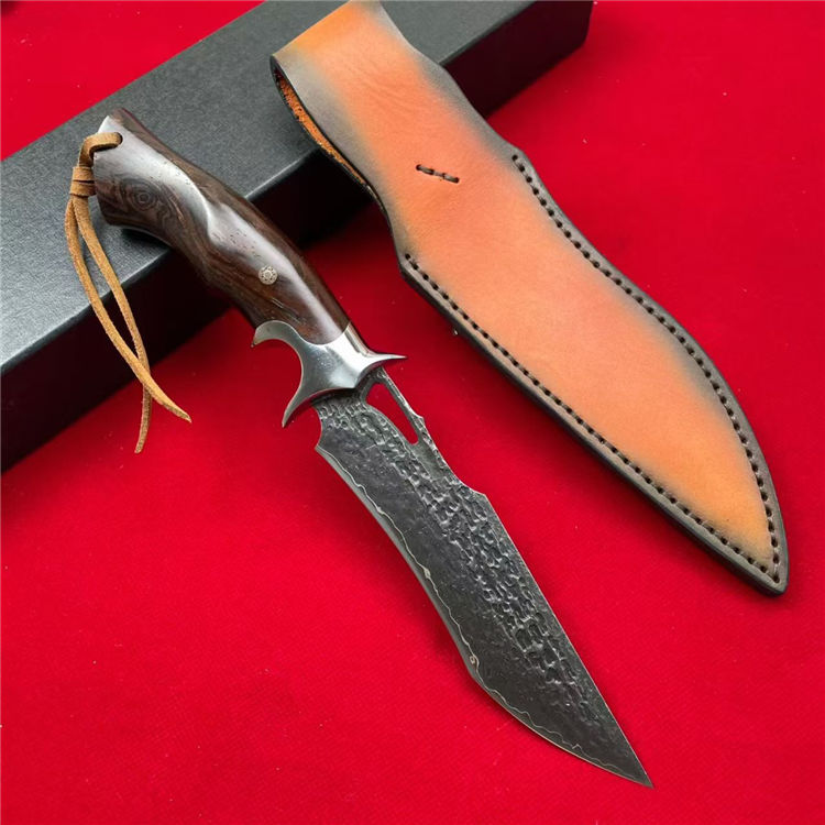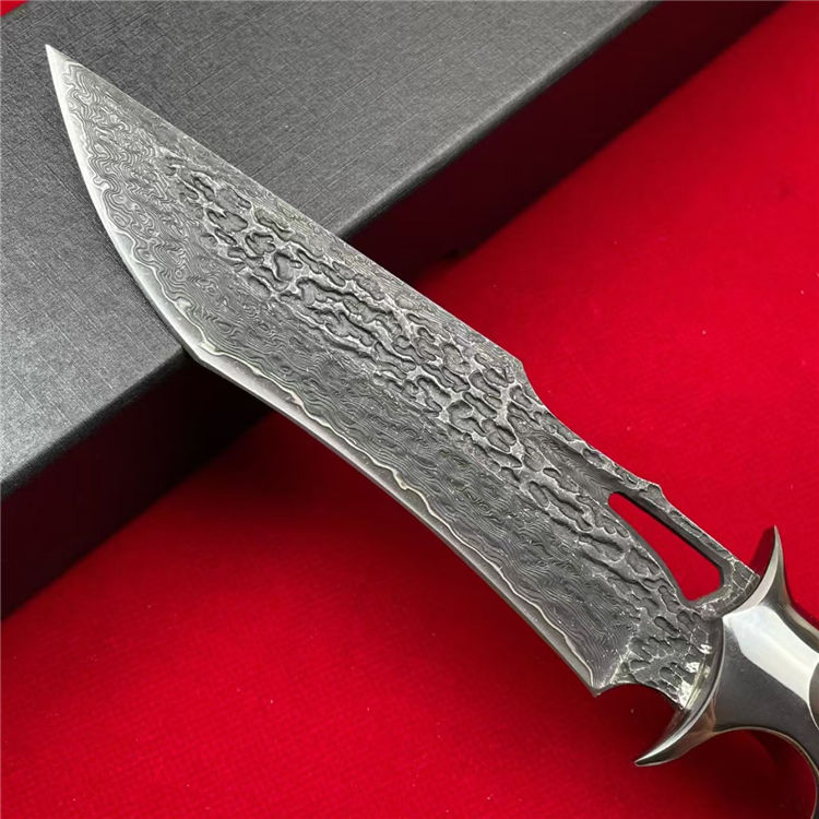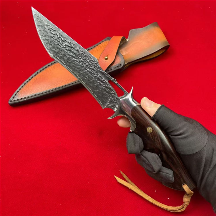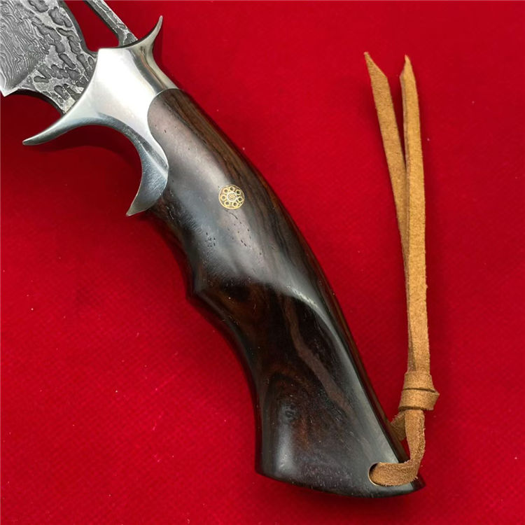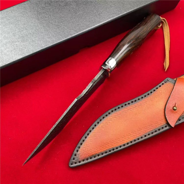 大马士革天马直刀 全长:28cm 刃宽:3.5cm 刃长:14.8cm 柄长:12.5cm 刃厚:4.5mm 刃材:大马士革钢 柄材:钢+檀木 刀重:225G/300G(含皮套) 毛量:367G 硬度:59-60HRC 包装:皮套+盒
