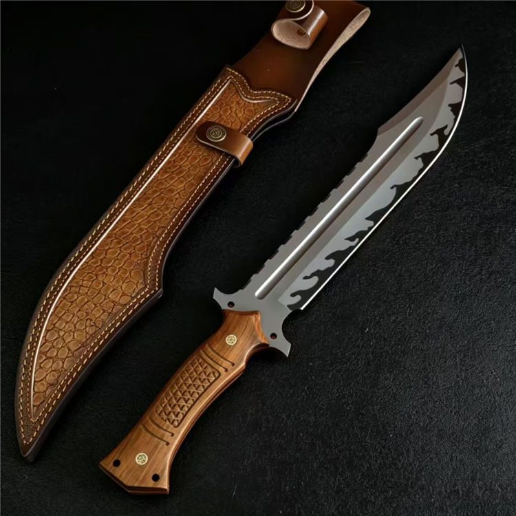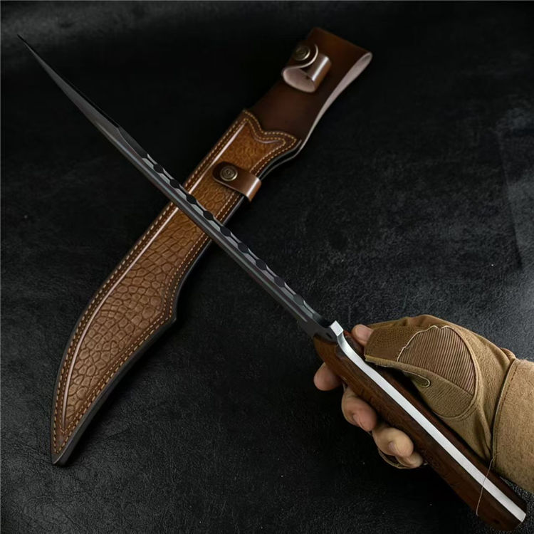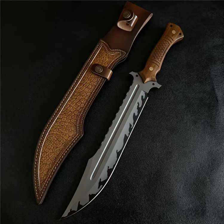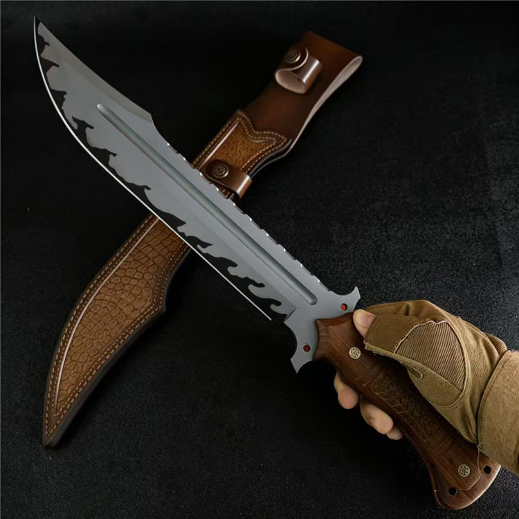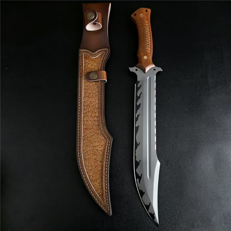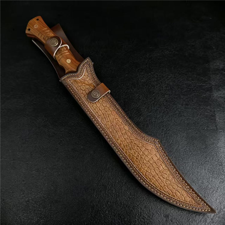 黑豹开山直刀 全长:50cm 刃长:31cm 刃厚:5.5mm 刃宽:5.7最大值 钢材:AUS-11 柄材:红檀木 柄长:16.5cm 重量:790g(含皮套949g)