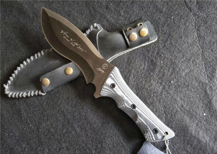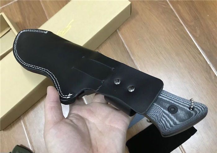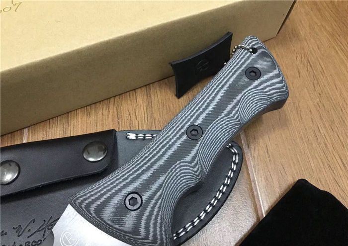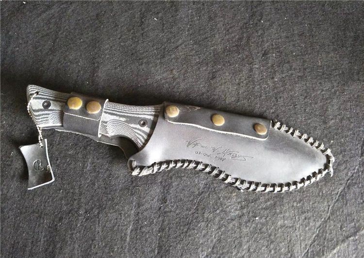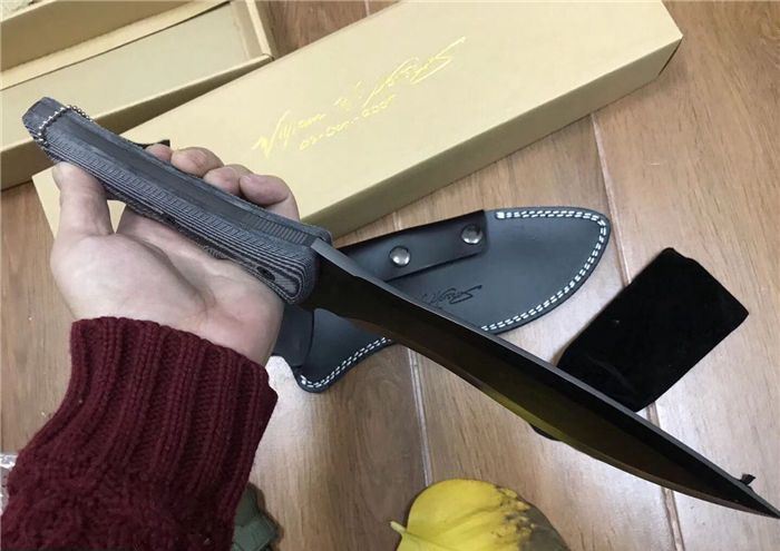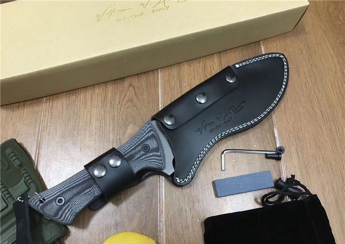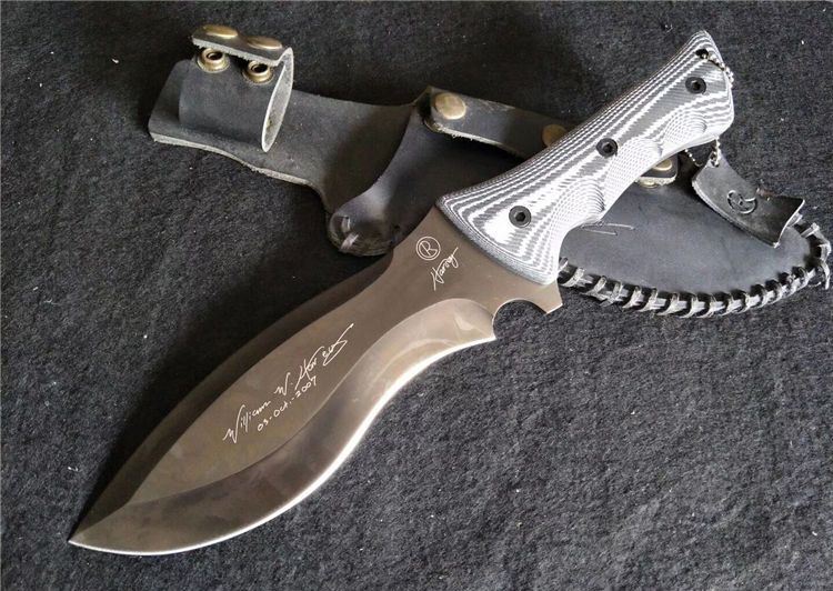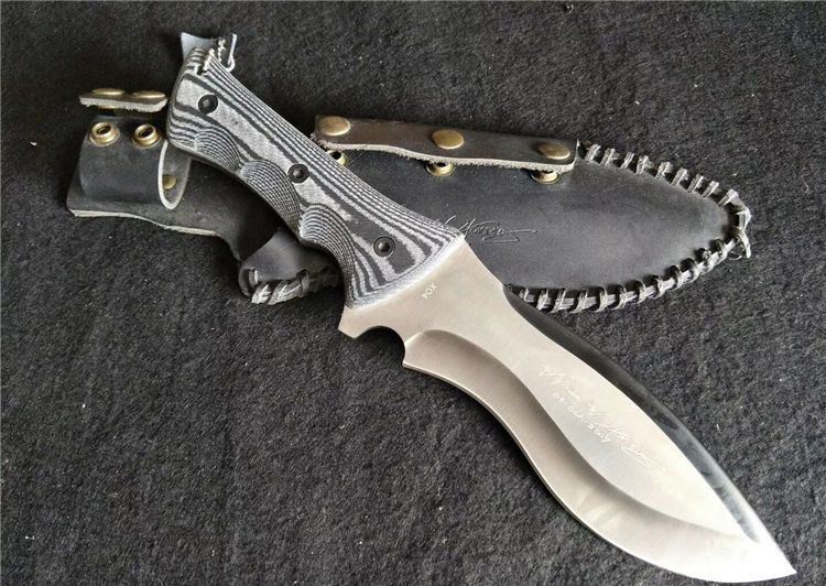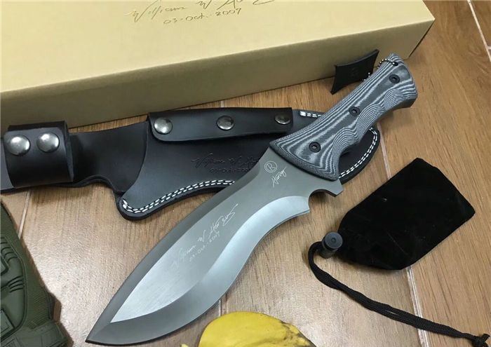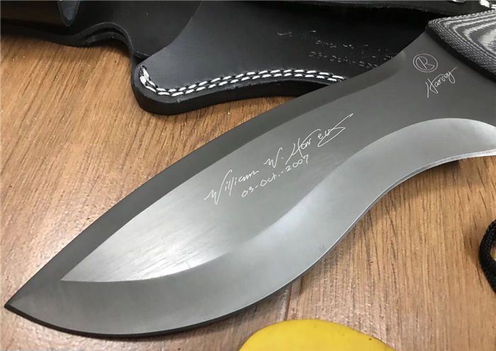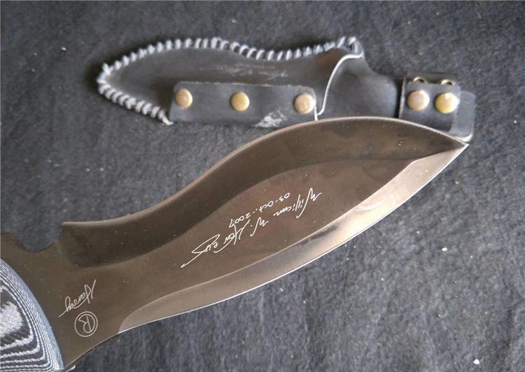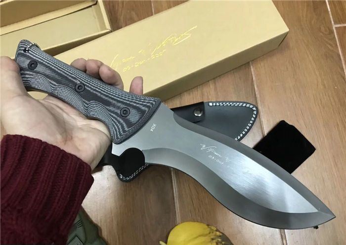 克里斯里夫致命复仇者手签版 全长:35.5cm 刃长:18cm 刃宽:6.2cm (最宽处) 刃厚:0.62cm 刃材:5Cr15 硬度:57HRC 柄长:15.8cm 刀重:760克 总重:1380克(含包装物) 柄材:米克塔 表面:钛离子 包装:经典木合(配备用螺丝钉和螺母、刀石)