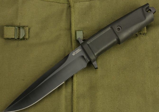 全 长: 29cm 刃 长: 16cm 刃 厚: 6.7mm 刃 材: 7CR13 硬 度: 58HRC 重 量: 580g 表 面: 黑钛 柄 材: 橡塑 刀 鞘: ABS 刀身采用了先进的真空离子镀碳钛,双刃开锋,纯手工打磨具有优越的穿透性. 钢材为65MN(弹簧钢)尼龙刀柄,有弹性,手感非常好 刀鞘为ABS压制,配有绑腿带和加长腰带.完全按照正品1:1制作,所有的配件都可以和正品通用,刀刃部刻有意大利陆战队徽,专为意大利海军陆战队生产配备。