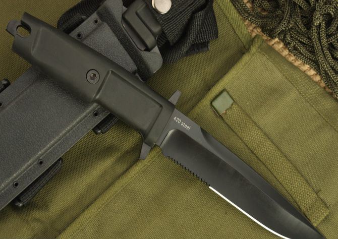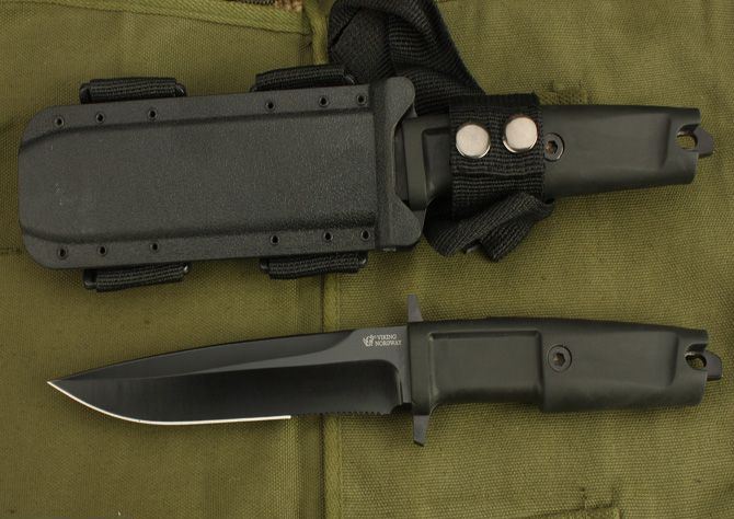 极端武力现役校官配刀 全 长: 29cm 刃 长: 16cm 刃 厚: 6.7mm 刃 材: 7CR13 硬 度: 58HRC 重 量: 580g 表 面: 黑钛 柄 材: 橡塑 刀 鞘: ABS 刀身采用了先进的真空离子镀碳钛,双刃开锋,纯手工打磨具有优越的穿透性. 钢材为65MN(弹簧钢)尼龙刀柄,有弹性,手感非常好 刀鞘为ABS压制,配有绑腿带和加长腰带.完全按照正品1:1制作,所有的配件都可以和正品通用,刀刃部刻有意大利陆战队徽,专为意大利海军陆战队生产配备。