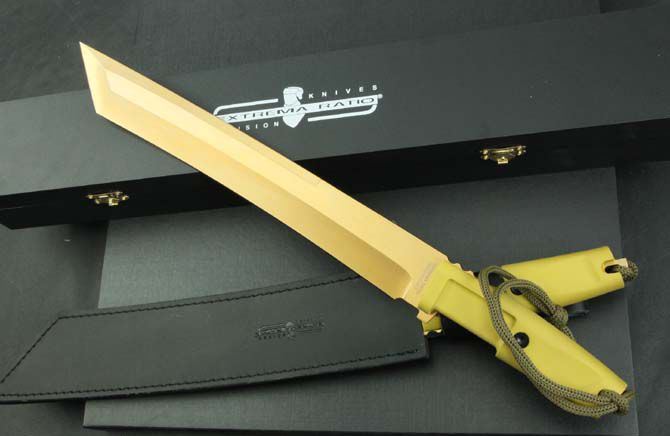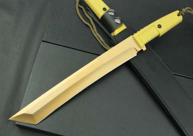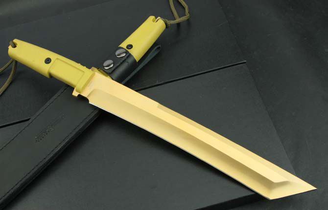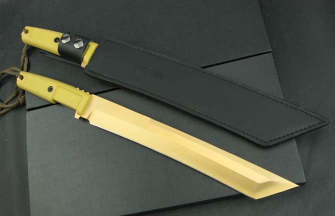 全 长:440mm 刃 长:300mm 柄 长:130mm 刃 宽:40mm 刃 厚:6.4mm 刃 材:5Cr13Mov 重 量:760g(含包装) 硬 度:57HRC 表 面:镀钛金 柄 材:ABS 锁 型:定锁 其 他:配皮套和木盒