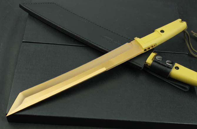 极端武力—TY13钛金直刀 全 长:440mm 刃 长:300mm 柄 长:130mm 刃 宽:40mm 刃 厚:6.4mm 刃 材:5Cr13Mov 重 量:760g(含包装) 硬 度:57HRC 表 面:镀钛金 柄 材:ABS 锁 型:定锁 其 他:配皮套和木盒
