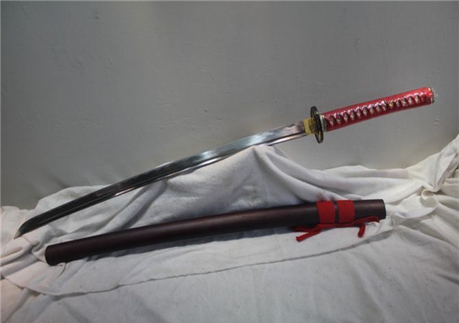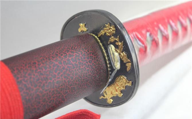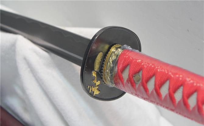 金虎武士刀 全长:102cm 刃长:72cm 柄长:27cm 刃宽:3.2cm 刃厚:0.75cm 刃材:高碳钢 鞘材:青皮油漆 装材:合金 柄材:硬木精细扎绳 加工工艺:精炼地基钢,传统古法12道研磨。 硬度区间:刃口60HRC;刀身:55HRC 性能:削纸断竹砍铁 备注:手工产品存在误差,规格仅供参考,请以实物为准!