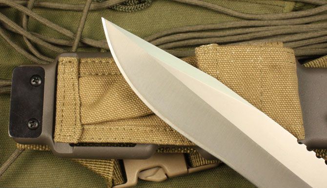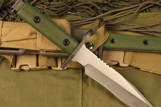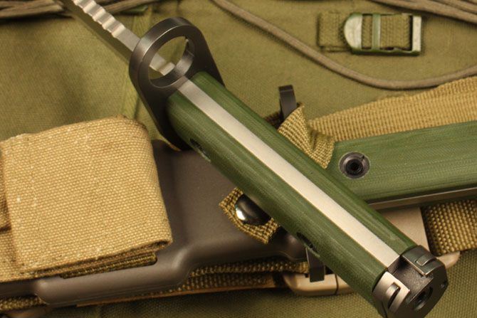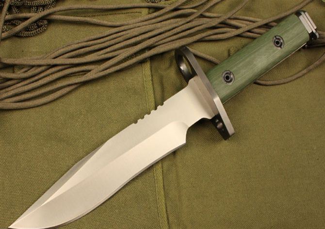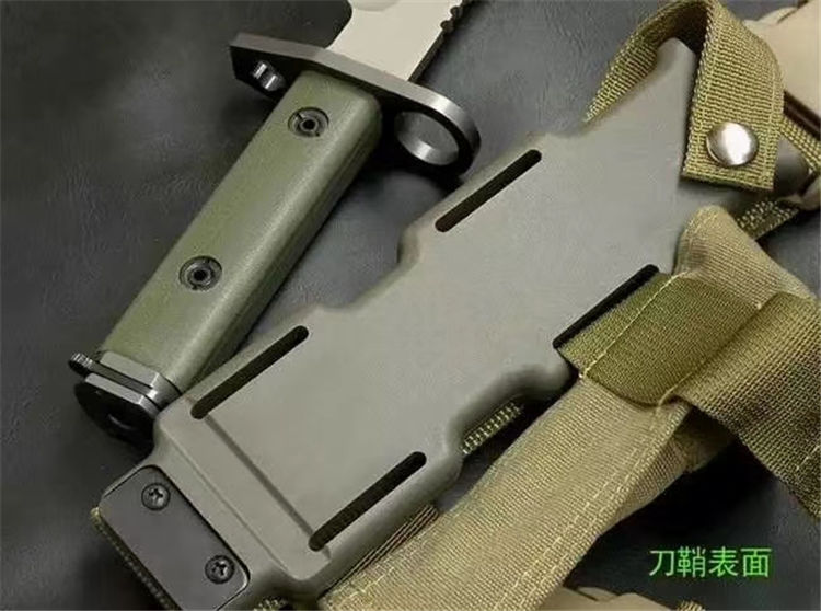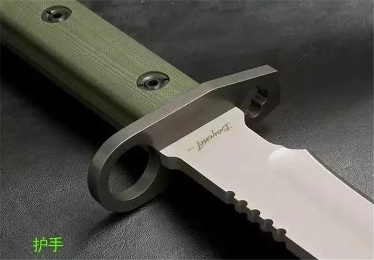 Bayonet D9枪刺 全 长: 32cm 刃 长: 16cm 刃 宽: 3.7cm(最宽处) 柄 长: 13cm 刃 材: D2钢 硬 度: 58-59HRC 表 面: 钛离子 刃 厚: 0.60cm 柄 材: 龙骨结构,绿色G10柄片 净 重: 560g 总 重: 1040g(包括纸盒和刀鞘) 包 装:原装纸盒 其 他:配附ABS刀鞘 品 质: 品质卓越