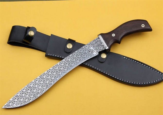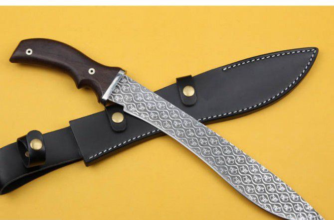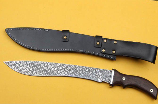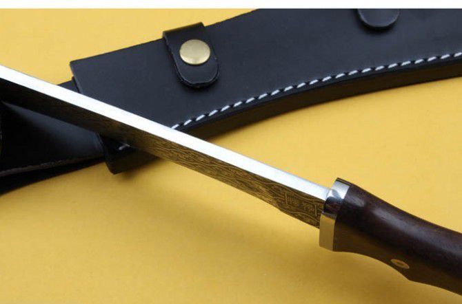 全 长:44.5cm 刃 长:31cm 刃 宽:4.5cm(最宽处) 刃 厚:6mm 柄 长:13.5cm 刃 材:5Cr15Mov 硬 度: 57HRC 柄 材: 钢头+檀木 毛 重:660克(含包装) 包 装:皮鞘 表 面:腐蚀