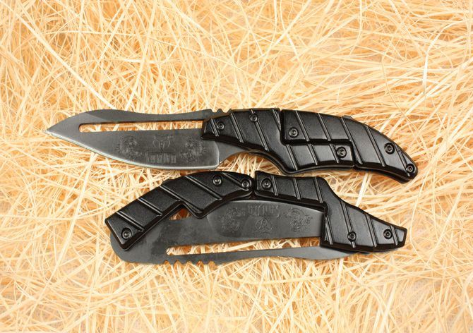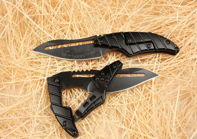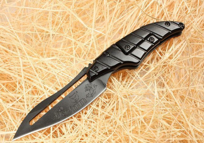 蚂蟥黑色 全长:17CM 刃长:7.2CM 闭合: 12.8CM 刃厚:0.25 CM 刃宽:2.3CM 柄材:金属铝 刃材:440 硬度:55HRC 重量: 100克 锁定:机械锁 刃口:锋利表面 处理:黑钛处理带背夹,原厂纸盒。 独特的造型,创新的操作方式,打破传统构思,令人焕然一新! 开刀:刀柄尾端的三角部分可以象活动夹子一样,用手指稍用力一夹,即可将刀刃打开。(看附图) 关刀:同样压住刀柄三角尾部,即可将刀刃收起。(看附图)