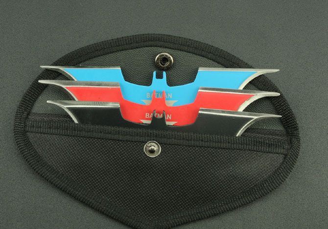 蝙蝠三色飞镖 钢材:3Cr13Mov 长度:14.5cm 刃宽:5cm(一边) 刃厚:2.5cm 总重:210g(含包装) 表面:氧化黑色+红色+蓝色 刀套:尼龙套 其它:三支装