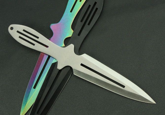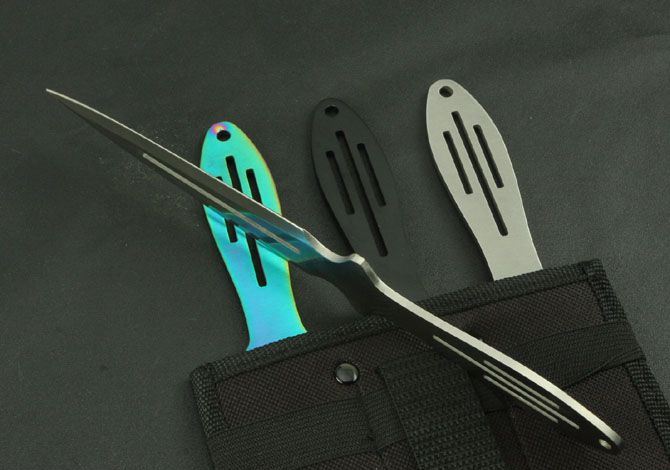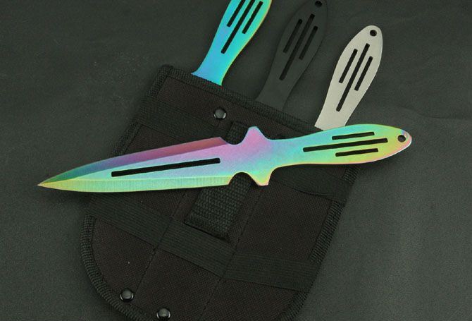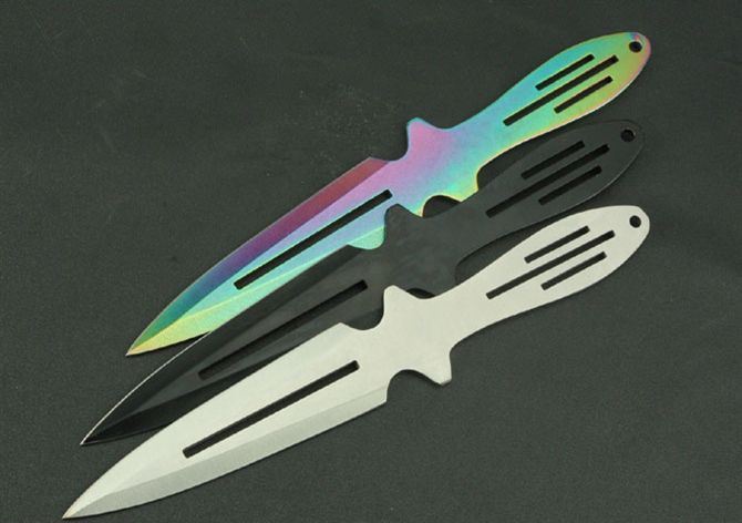 钢材:3Cr13Mov 长度:25.8cm 刃宽:3cm 刃厚:2.8cm 柄长:10cm 总重:290g(含包装) 表面:黑色 白色 彩色 刀套:尼龙套 其它:三支装