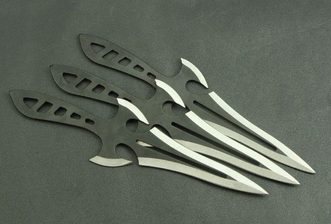 钢材:3Cr13Mov 长度:19cm 刃宽:5cm(最宽处) 刃厚:025cm 柄长:7cm 总重:160g(含包装) 表面:喷黑色 刀套:尼龙套 其它:三支装