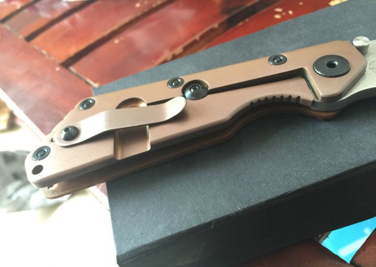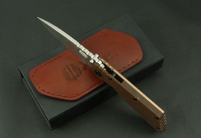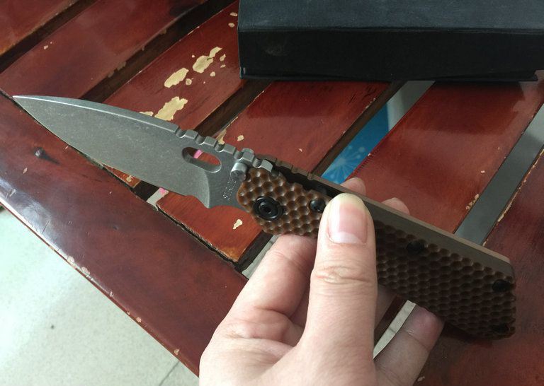 STRIDER—火烧色折刀(平纹和窝纹) 全长:220mm 刃长:85mm 刃厚:5mm 刃宽: 3.2mm 刃材: D2 柄材: 正面G10,反面钛合金(数控加工) 硬度: HRC61-62 重量:280g(含包装)