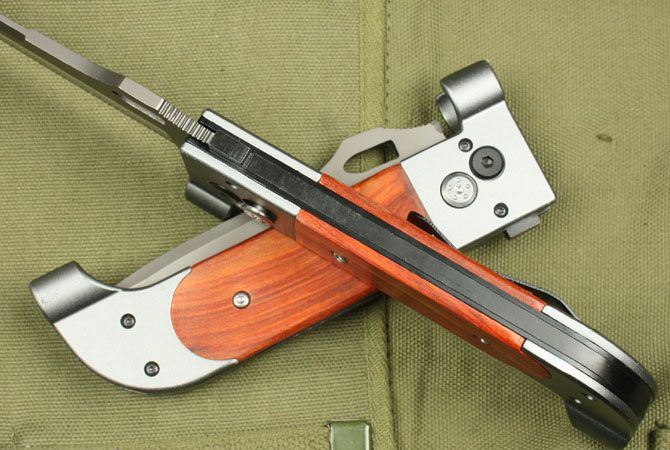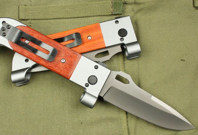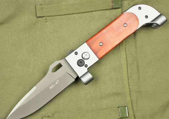AK-47冲锋英雄 全长:25.7cm 刃长:11.3cm 柄长:14.5cm 刃厚:3.2mm 刃宽: 3.6cm 刃材: 3Cr13 柄材: 红木+双铝头 硬度:53HRC 净重:260克 毛重:270克 表面处理:镀钛 锁型:线锁