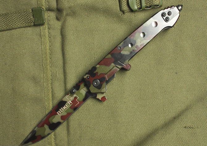 博克-野战兵 全长:22cm 刃长:9.5cm 柄长:12.5cm 刃厚:2.2mm 刃宽: 1.8cm 刃材: 3Cr13 柄材: 全钢 硬度: 53HRC 净重:160克 毛重:170克 表面处理:氧化迷彩 锁型:半自动