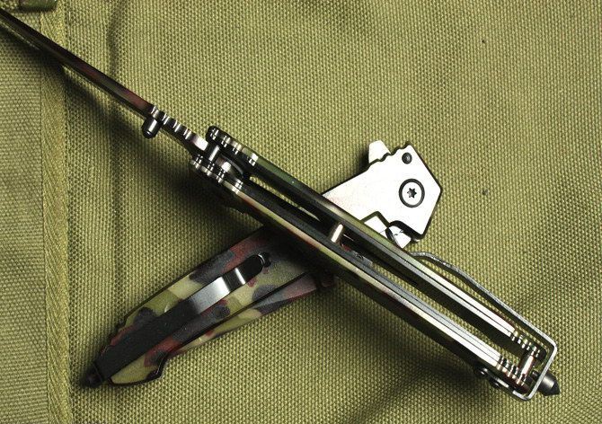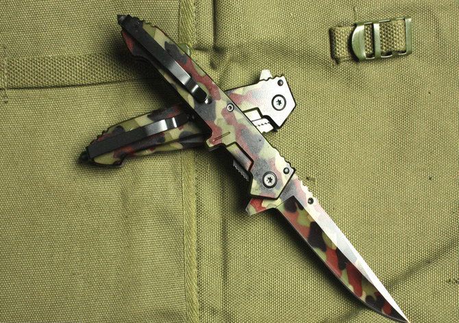 全长:22cm 刃长:9.5cm 柄长:12.5cm 刃厚:2.2mm 刃宽: 1.8cm 刃材: 3Cr13 柄材: 全钢 硬度: 53HRC 净重:160克 毛重:170克 表面处理:氧化迷彩 锁型:半自动