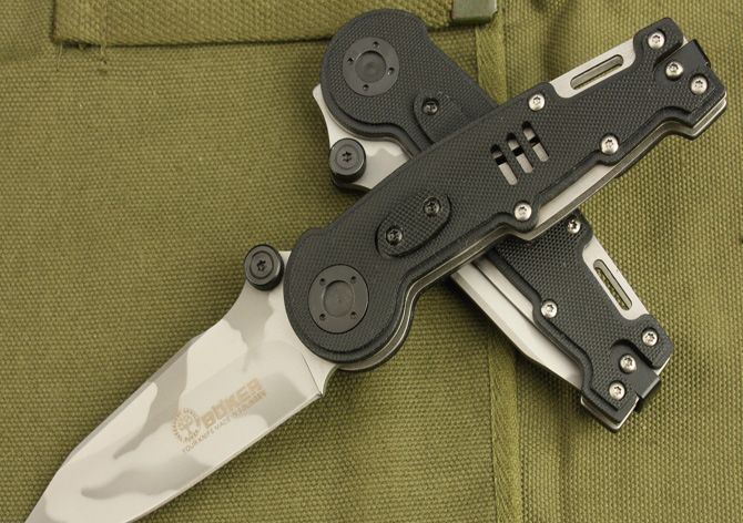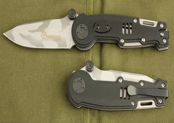 博克 BOKER-099战术折刀 全长:20.2CM 刃长:8.5CM 刃厚: 0.32CM 刃宽:3.6CM (最宽处) 柄长: 11.7CM 柄厚: 1.5CM 涂层:发黑 柄材: G10片+钢垫 重量:180克 锁定方式:开锁按钮设在刀把侧面 带腰夹