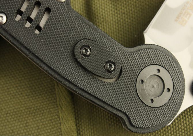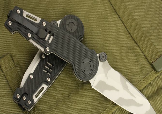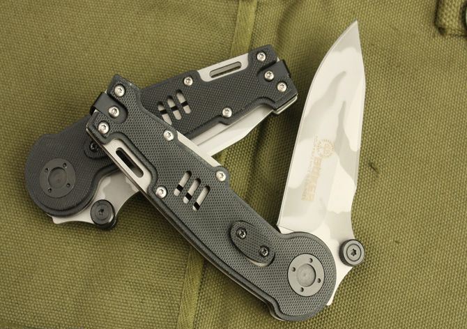 全长:20.2CM 刃长:8.5CM 刃厚: 0.32CM 刃宽:3.6CM (最宽处) 柄长: 11.7CM 柄厚: 1.5CM 涂层:发黑 柄材: G10片+钢垫 重量:180克 锁定方式:开锁按钮设在刀把侧面 带腰夹