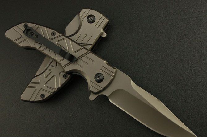 全 长:22cm 刃 长:9.5cm 柄 长:12.5cm 刃 宽:2.5cm(最宽处) 刃 厚:3.8mm 刃 材:3Cr13 硬 度:55HRC 刀 柄:钢 表 面:镀钛 重 量:220克 锁定方式:快开