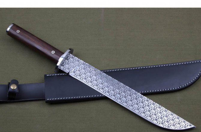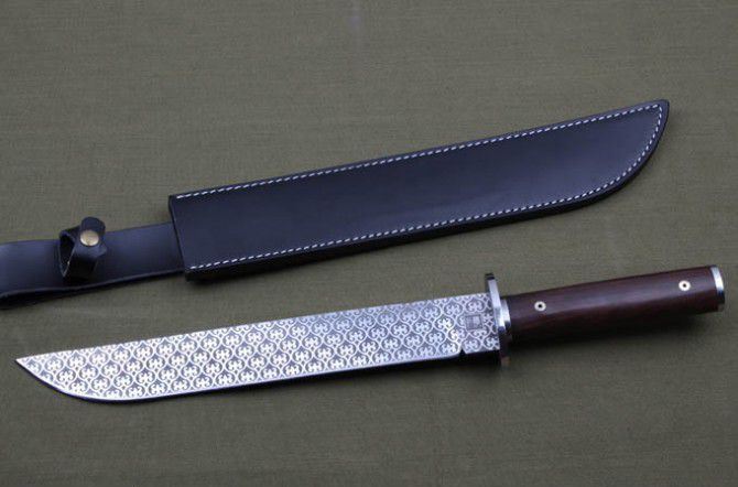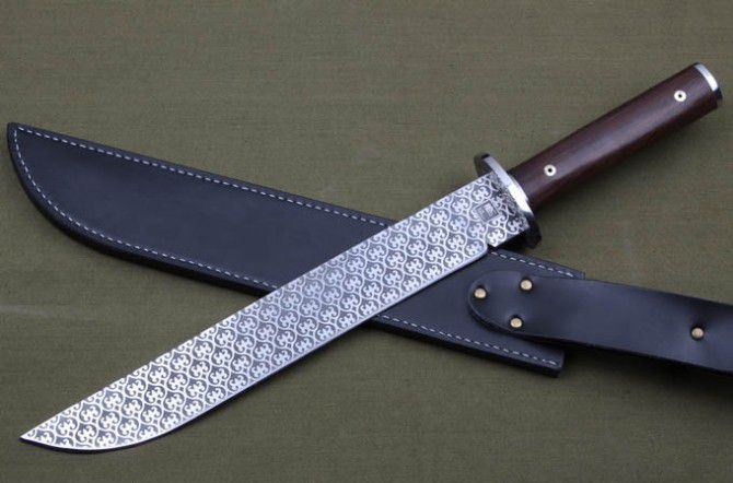 全 长:55cm 刃 长:37cm 刃 宽:5cm(最宽处) 刃 厚:5.8mm 柄 长:18cm 刃 材:7Cr17Mov 硬 度: 57HRC 柄 材: 双钢头+檀木 毛 重:1200克(含包装) 包 装:皮鞘 表 面:腐蚀