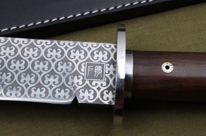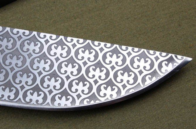 户撒弧月刀(腐蚀纹) 全 长:55cm 刃 长:37cm 刃 宽:5cm(最宽处) 刃 厚:5.8mm 柄 长:18cm 刃 材:7Cr17Mov 硬 度: 57HRC 柄 材: 双钢头+檀木 毛 重:1200克(含包装) 包 装:皮鞘 表 面:腐蚀