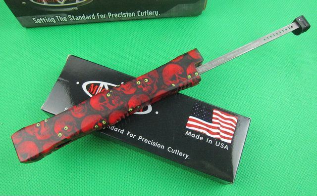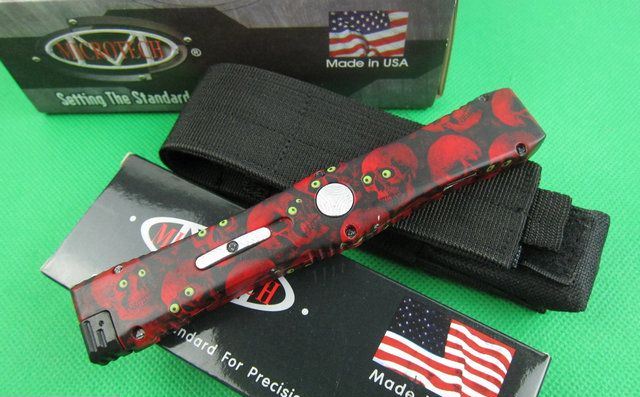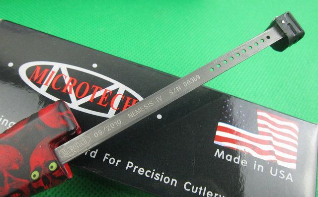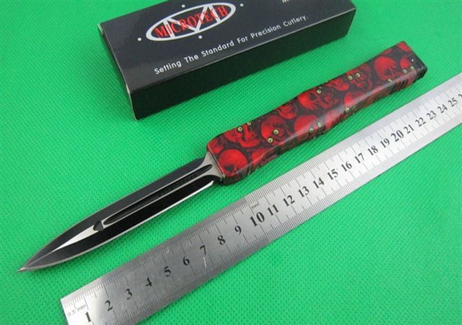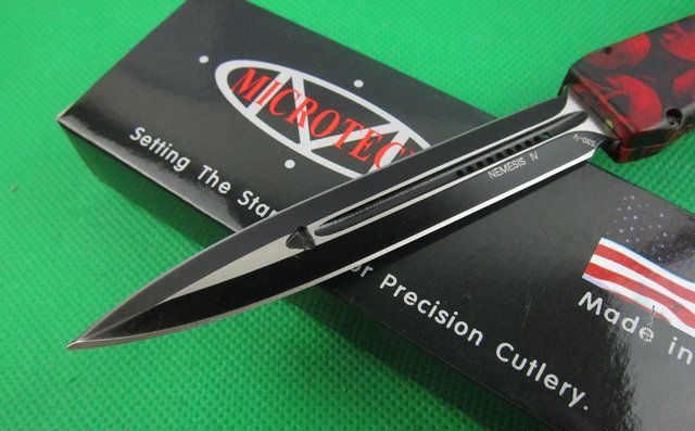 Microtech微技术复仇女神直跳刀 红色 全 长: 25.5cm 刃 长: 10.1cm 刃 厚: 3.2mm 刃 材: S-30V 硬 度: 58HRC 刀净重:200克 总重量: 310克(含包装物) 表 面: 红色钛 柄 材: 锌铝合金 刀 鞘: 尼龙 锁 闭: 弹簧直出+保护装置,使用看说明书.