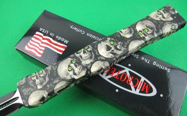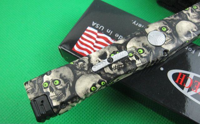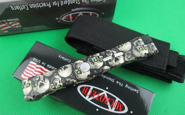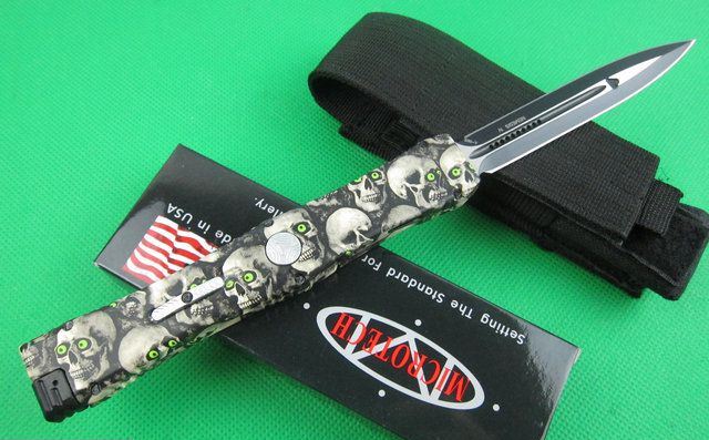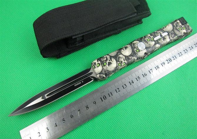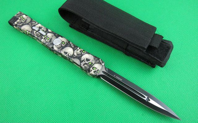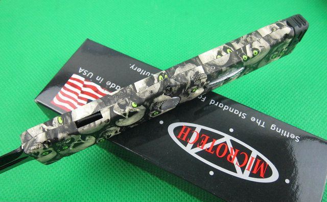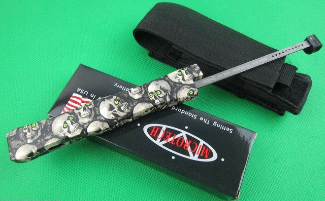 Microtech微技术复仇女神直跳刀 迷彩 全 长: 25.5cm 刃 长: 10.1cm 刃 厚: 3.2mm 刃 材: S-30V 硬 度: 58HRC 刀净重:200克 总重量: 310克(含包装物) 表 面:鬼头图案 柄 材: 锌铝合金 刀 鞘: 尼龙 锁 闭: 弹簧直出+保护装置,使用看说明书