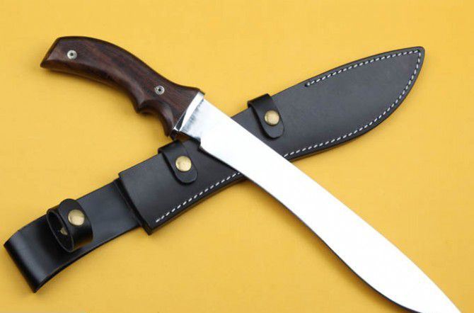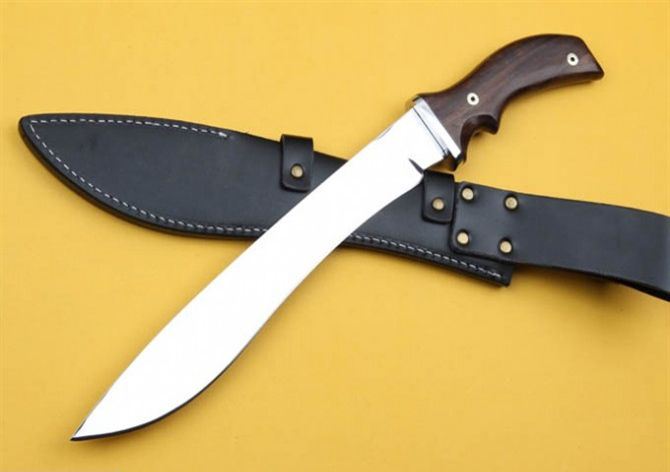 疯狗弯刀 ( 镜光 ) 全 长:44.5cm 刃 长:31cm 刃 宽:4.5cm(最宽处) 刃 厚:6mm 柄 长:13.5cm 刃 材:5Cr15Mov 硬 度: 57HRC 柄 材: 钢头+檀木 毛 重:660克(含包装) 包 装:皮鞘 表 面:镜光