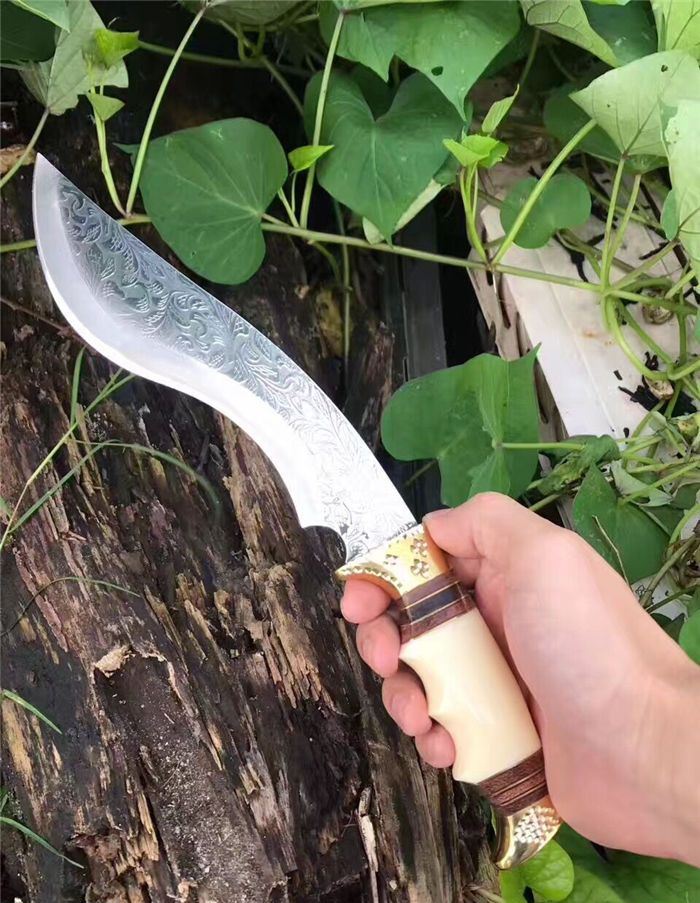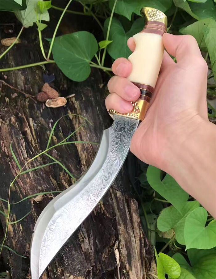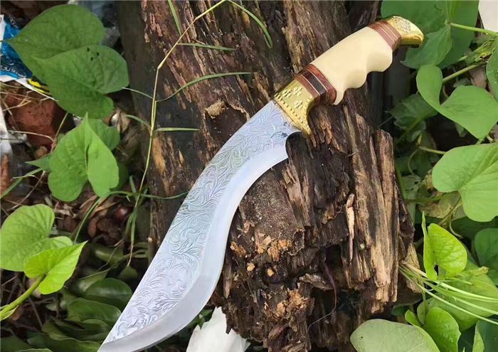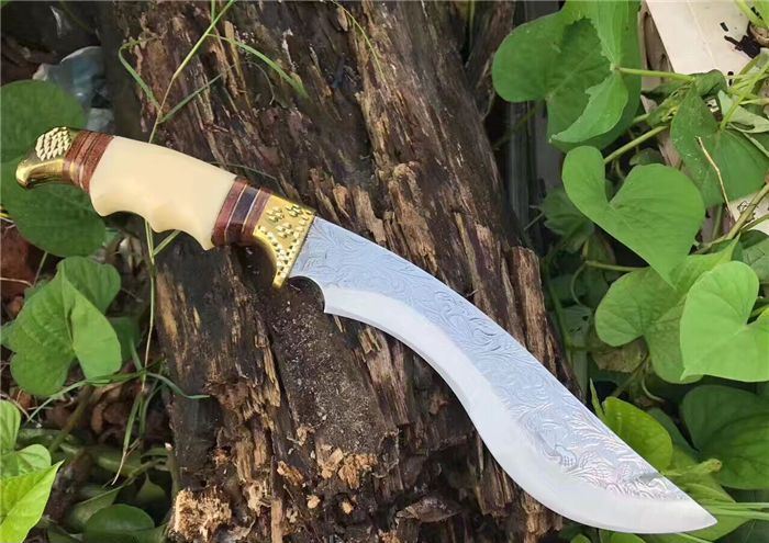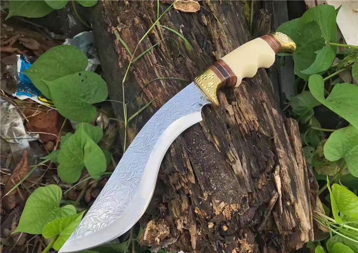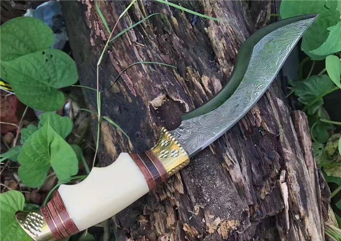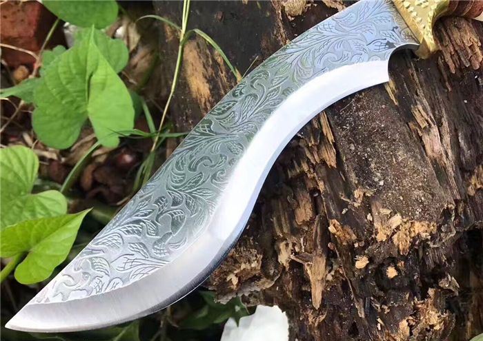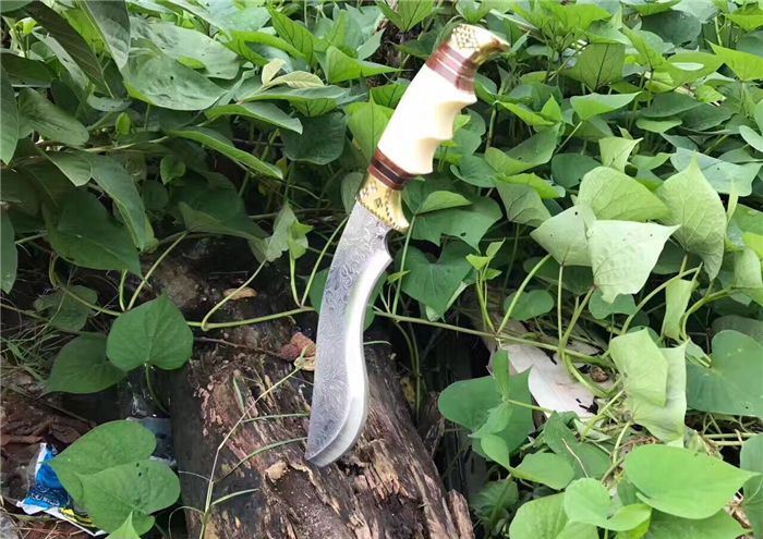 小月牙狗腿刀 全 长:295mm 刃 长:188mm 柄 长:113mm 刃 宽:40mm 刃 厚:4.0mm 刃 材:5Cr13Mov 重 量:399g(含包装) 硬 度:57HRC 表 面:腐蚀纹 柄 材:双铜头+兽骨 锁 型:定锁 其 他:配牛皮套