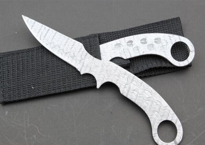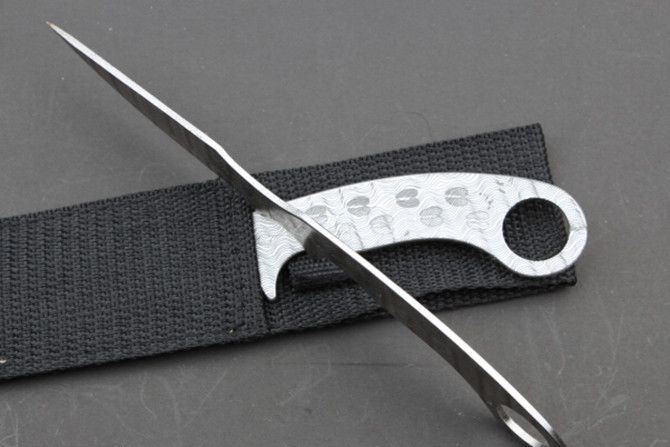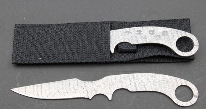 波纹爪镖(单支装) 全长:17.7CM 刃长:6.8CM 柄长: 10.9CM 刃材:4C13 硬度: 56HRC 刃厚: 0.2CM 刃宽:2CM (最宽处) 涂层:腐蚀 柄材: 一体钢 刀鞘:尼龙套 重量:80g(含包装)