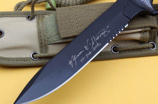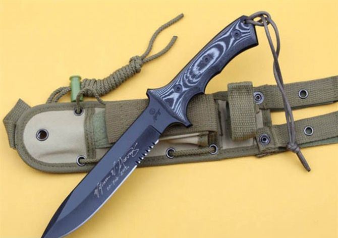 绿扁帽2012(手签版) 全 长: 32cm 刃 长: 18.5cm 刃 厚: 6mm 刃 材: 440C 硬 度: 58HRC 表 面: 黑钛 柄 材: 米卡塔 刀 鞘: 尼龙