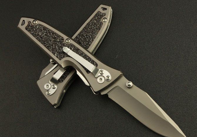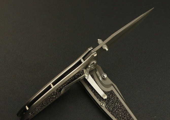 博克—04折刀 全 长:17cm 刃 长:7.3cm 柄 长:10cm 刃 厚:0.28cm 刃 材:3Cr13 柄 材:全钢 硬 度:55HRC 表 面:灰钛 重 量:120g 锁 定: 侧锁